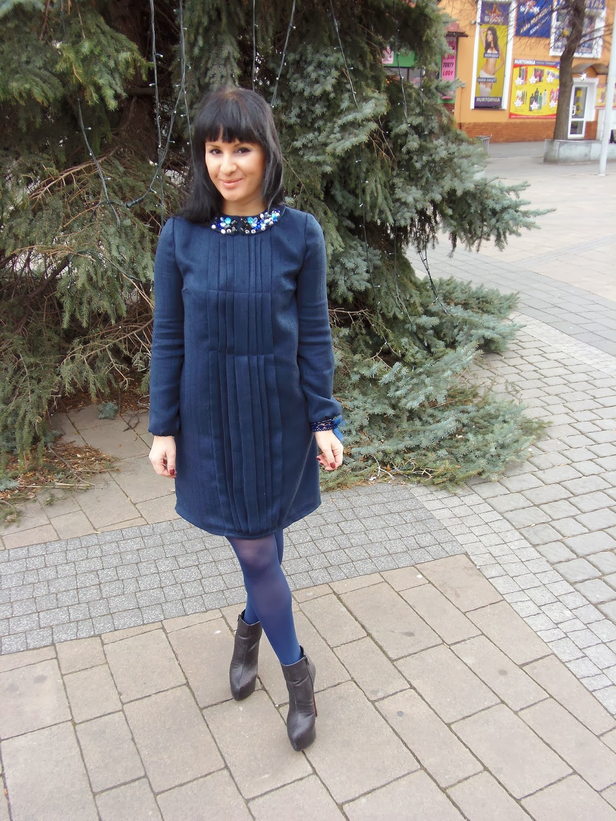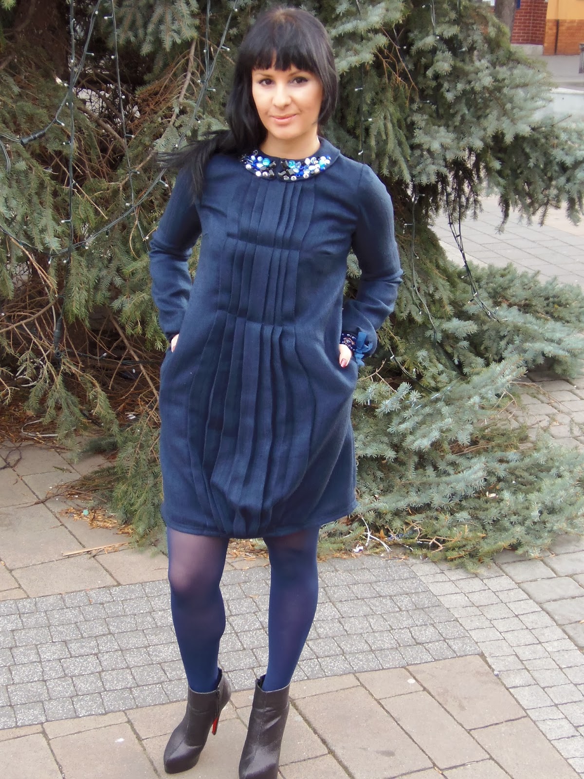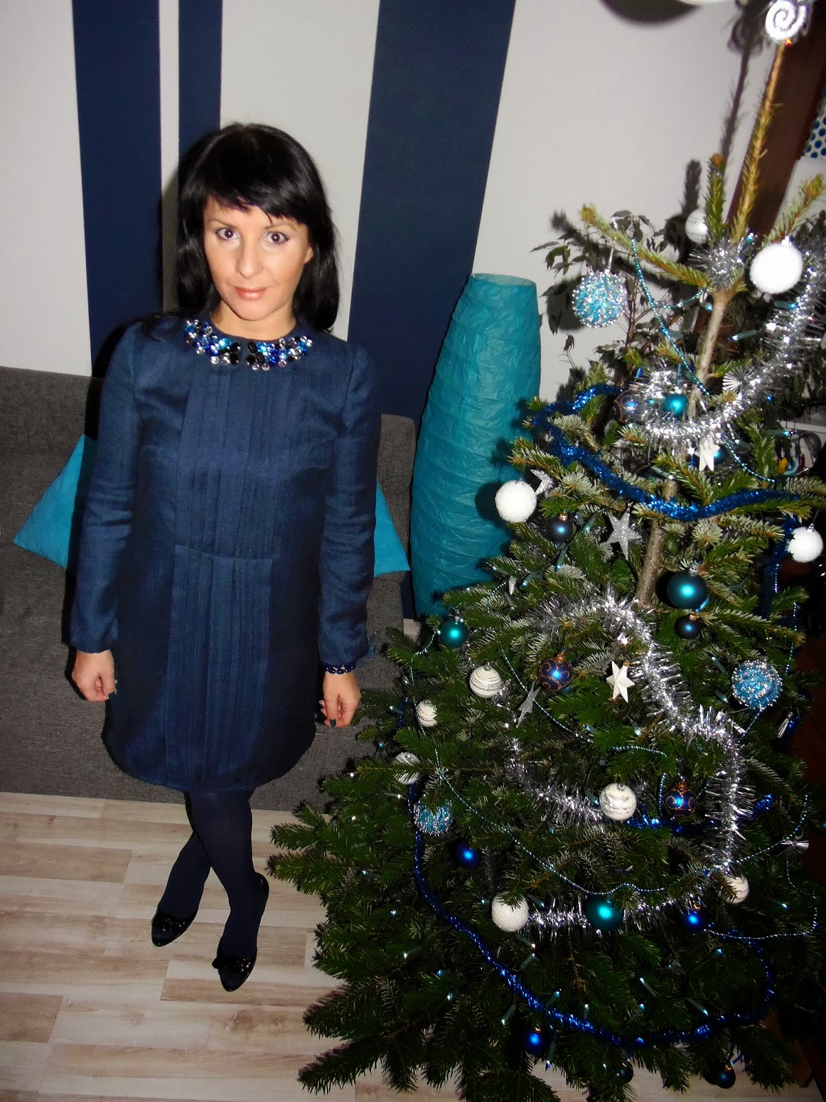 Sukienkę świąteczną zaplanowałam sobie już wcześniej, niestety końcówka roku to u mnie ciągła gonitwa z czasem, mnóstwo zajęć, rzeczy do załatwienia i przez to z ledwością zdążyłam ją uszyć na kolację wigilijną. Zamiast wymyślić coś prostszego uparłam się na jakieś plisowania i zdobiony kryształkami kołnierzyk. Stworzenie plis to była prawdziwa męka, oczywiście początkowo zszyłam je nie tak jak trzeba - opis w Burdzie mi niestety nie pomógł. Dodatkowo tkanina wełniana dosyć luźno tkana strasznie się pruła - w mieszkaniu był niekończący się bałagan.