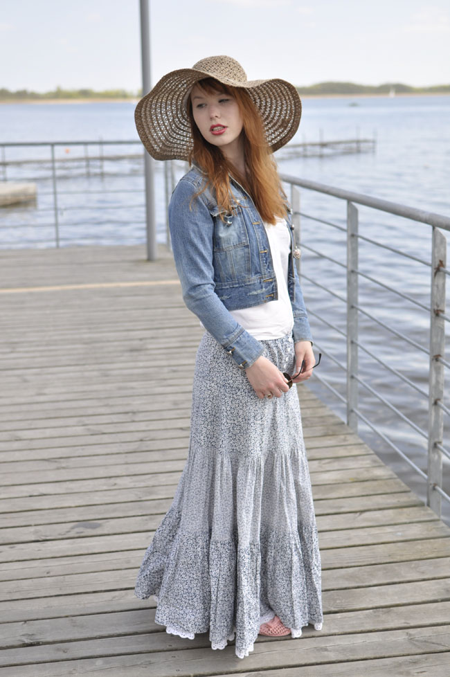 Tego cudownego dnia zdecydowałam się na moją ulubioną spódnicę maxi.. Jest pokryta drobnymi kwiatkami i zakończona jest delikatną koronką.. Do tego biała koszula i jeansowa katana;) Kapelusz wraz z wiosenno letnią aurą powrócił do łask.. Różowe melissy to mój ostatni, bardzo trafny nabytek. Są nieziemsko wygodne, jakbym chodziła boso...