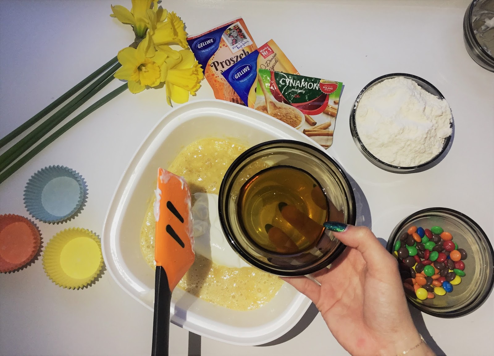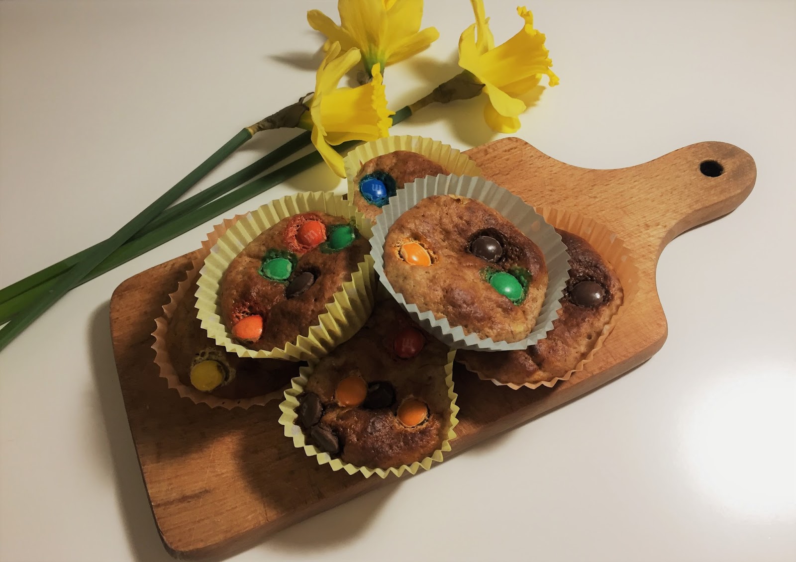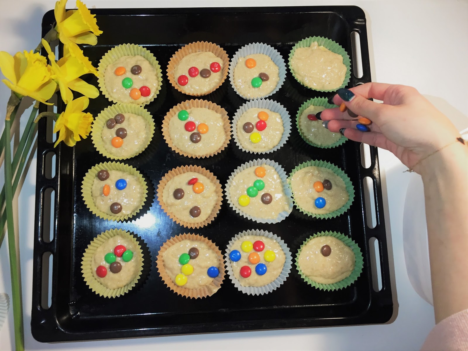 Po wymieszaniu całej masy nadszedł czas na rozłożenie do foremek. Mi ciasta starczyło na 16 babeczek. Gdy nałożymy masę, nadchodzi czas na dekoracje. Ja do tego użyłam M&M's-ów, ale dobrym dodatkiem będą również bakalie i owoce np jagody.