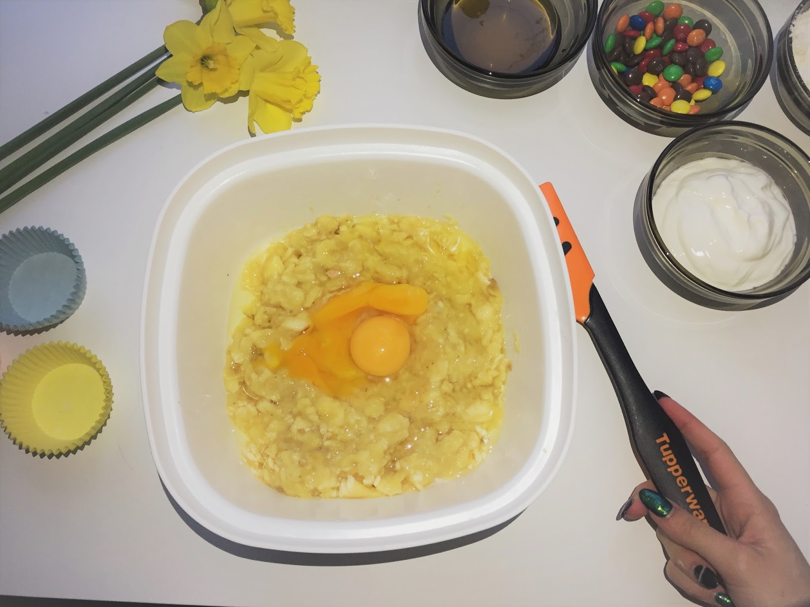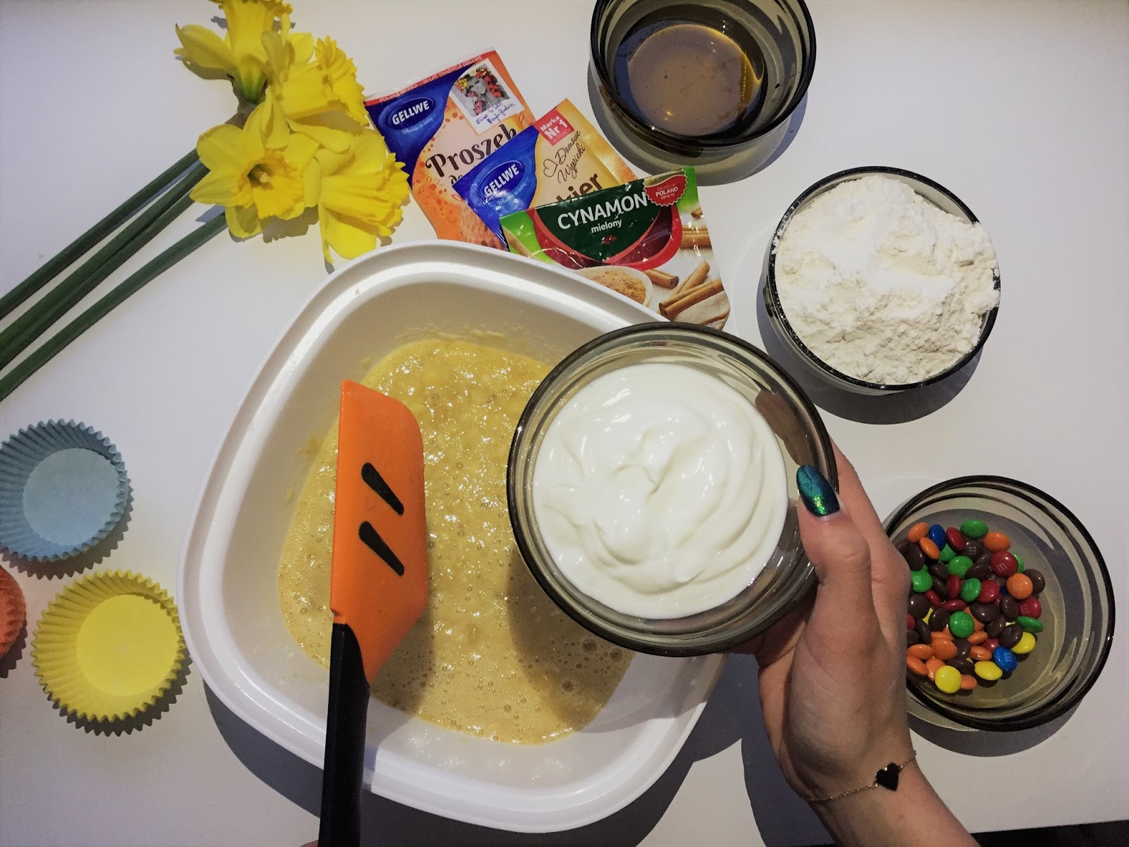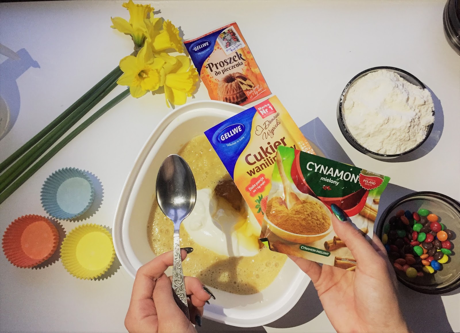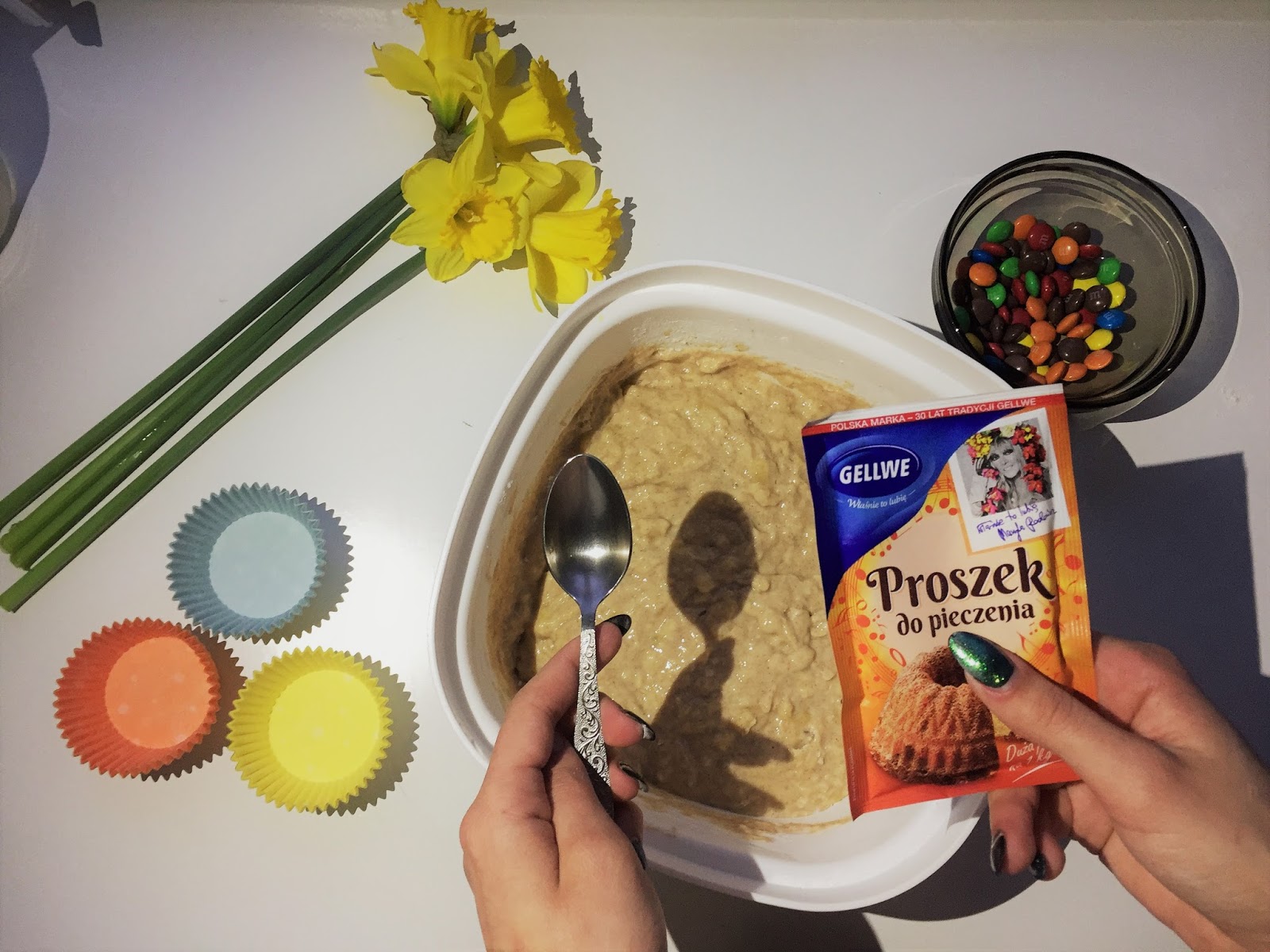 Po wymieszaniu całej masy nadszedł czas na rozłożenie do foremek. Mi ciasta starczyło na 16 babeczek. Gdy nałożymy masę, nadchodzi czas na dekoracje. Ja do tego użyłam M&M's-ów, ale dobrym dodatkiem będą również bakalie i owoce np jagody.