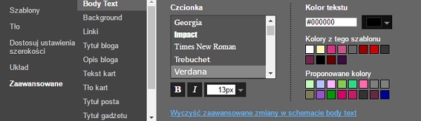 Niektóre elementy takie jak rodzaj, rozmiar czcionki, kolorystyka, tło bloga itp. możemy zmienić klikając:
