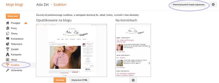 Wchodzimy do ustawień bloga i klikamy w "SZABLON" a następnie w "Utwórz/przywróć kopię zapasową".