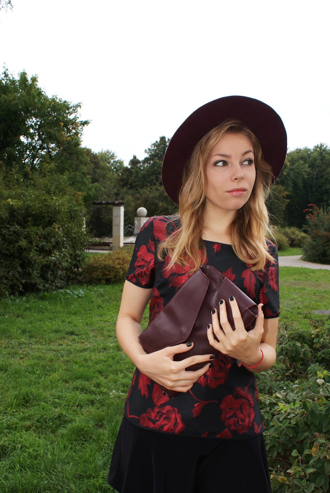 Dzisiaj możecie mnie zobaczyć w bardzo prostym zestawieniu, kloszowana czarna spódniczka, 'sztywna' bluzka w burgundowe kwiaty, czarne szpilki. Całość dzisiejszej stylizacji dopełnia kapelusz z dużym rondem.