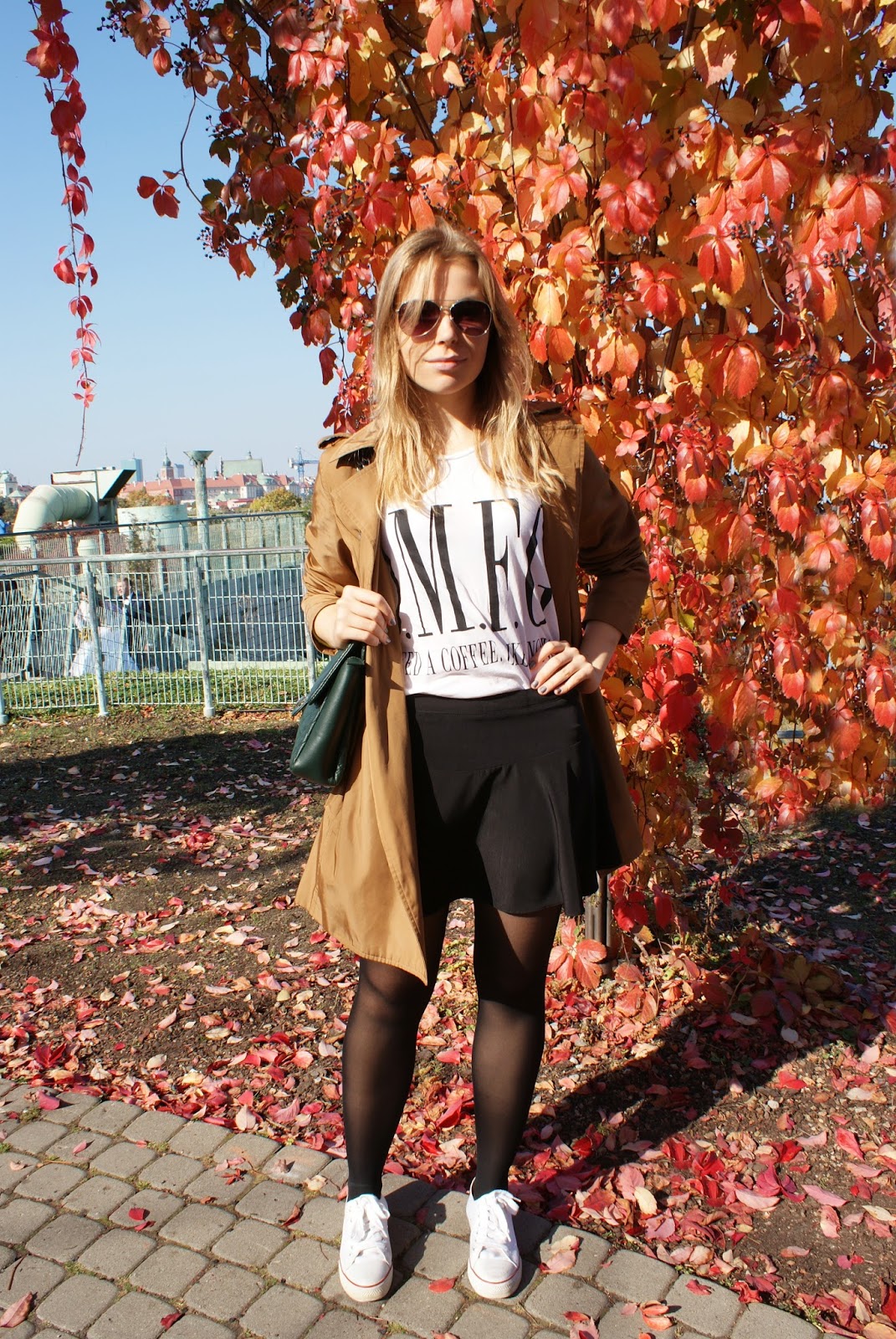 Beżowy trencz to pozycja obowiązkowa w naszej garderobie w takie jesienne dni jak ten. Do tego obowiązkowo okulary przeciwsłoneczne i białe wygodne trampki.