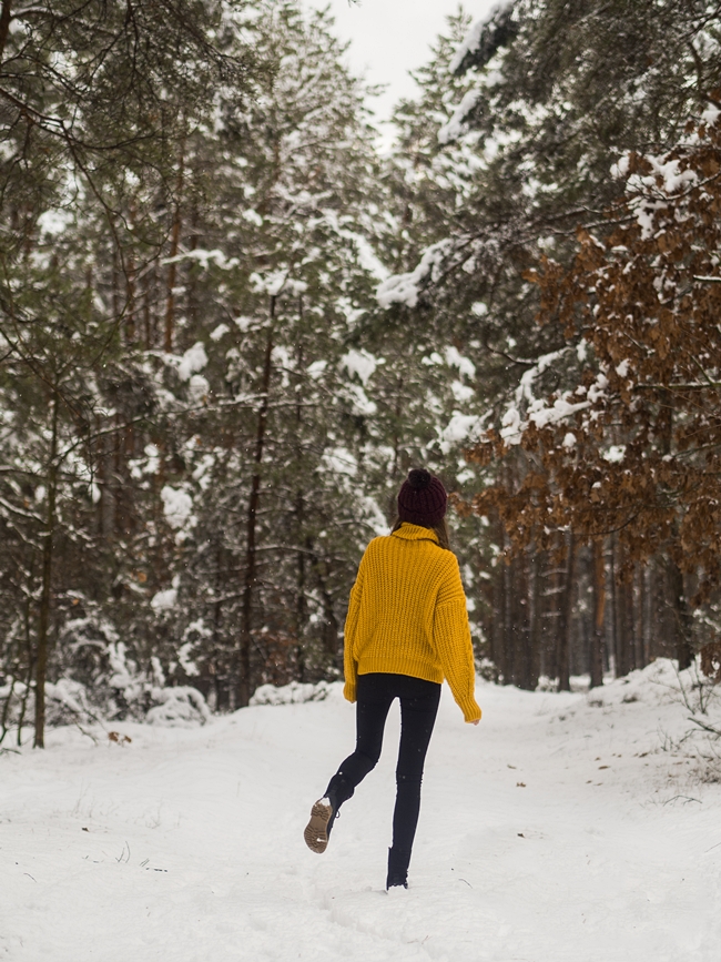 Powróćmy do stylizacji. Jestem bardzo zadowolona z mojego wyprzedażowego zakupu, czyli zimowej czarnej parki. Jako dodatki stawiam na: długi i ciepły szal, czapkę oraz rękawiczki. W stylizacji pojawił się również musztardowy/żółty sweter. Uznałam, że element ten będzie pięknie prezentować się na tle śniegu. Sweter posiada przepiękny splot, ale z koloru nie jestem do końca zadowolona. Mam wrażenie, że na żywo jego odcień prezentuje się gorzej, niż na zdjęciach.