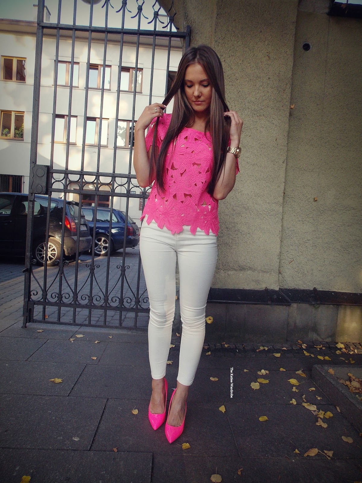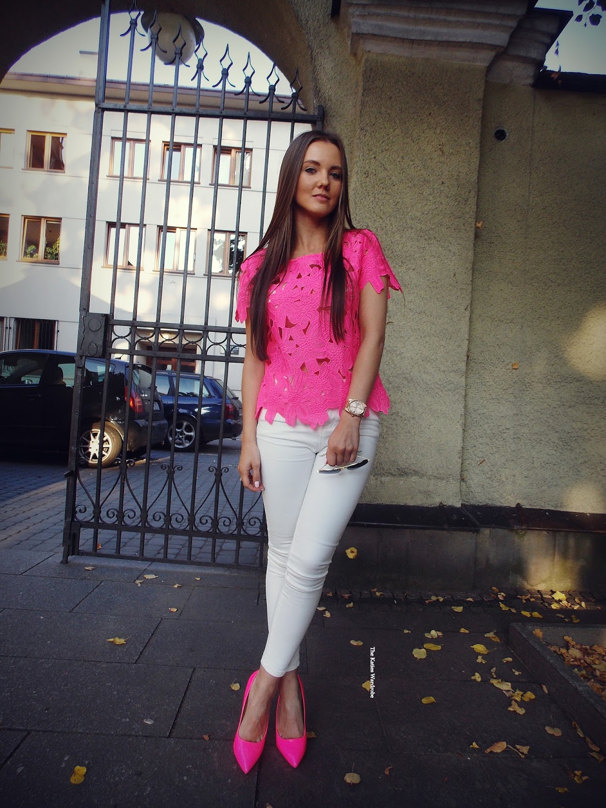 Co tam u Was słońca? bo u mnie zrobiło się zimno i deszczowo,aż nie chce mi się w to wierzyć,że już mamy jesień:(((,ale na przekór tego mam post zupełnie w innym klimacie:),białe spodnie (KLIK:)) połączyłam z neonowym różem:)