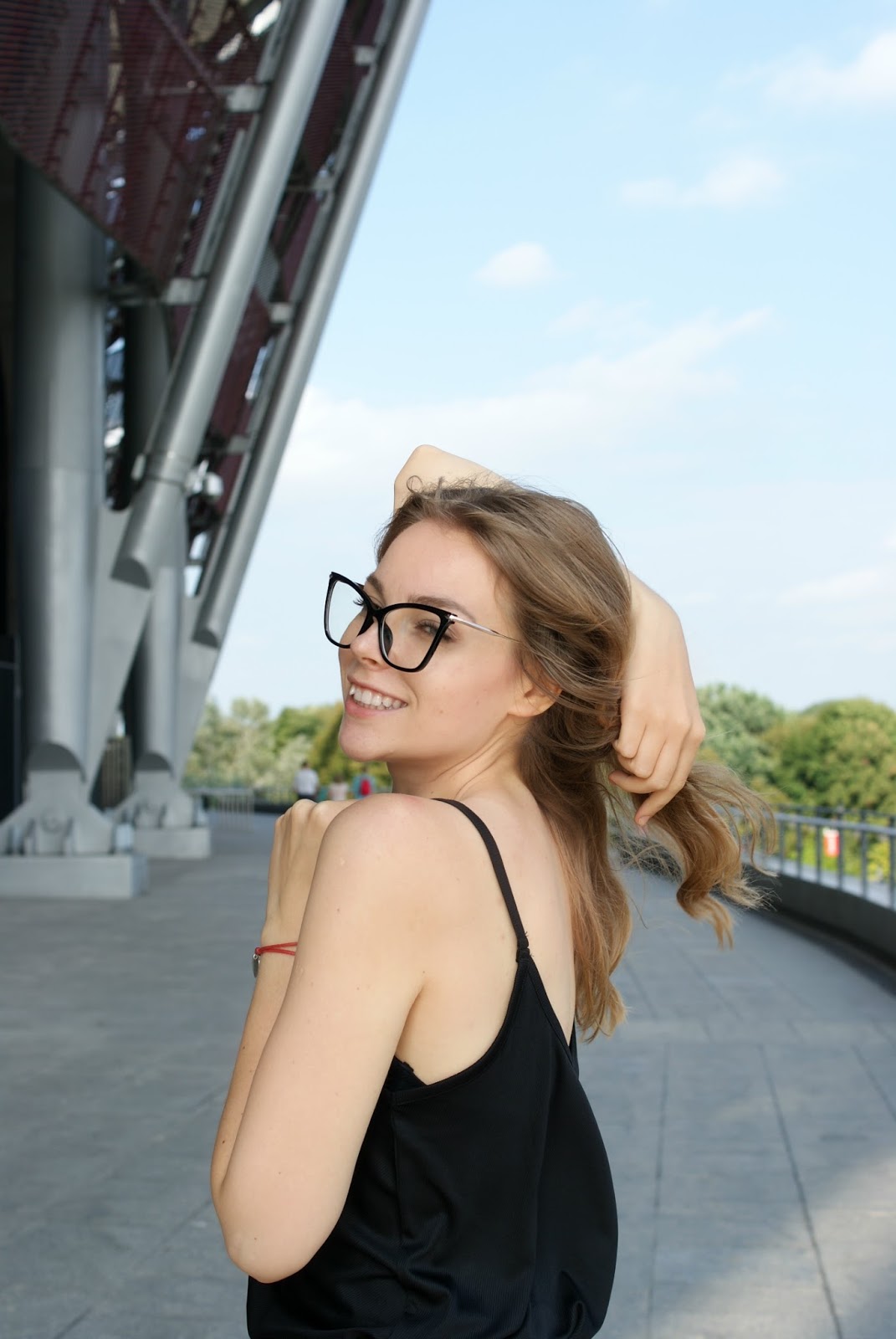 nie musimy zbytnio zastanawiać się z czym połączyć ten kolor. Proste jeansy i lekka bluzka na cienkie ramiączka stały się moim ulubionym połączeniem w ostatnich dniach. Okulary w dużych oprawkach świetnie wyglądają jako stylowy gadżet i uzupełniają całość! Twarz dzięki nim prezentuje się zupełnie inaczej. Co sądzicie?