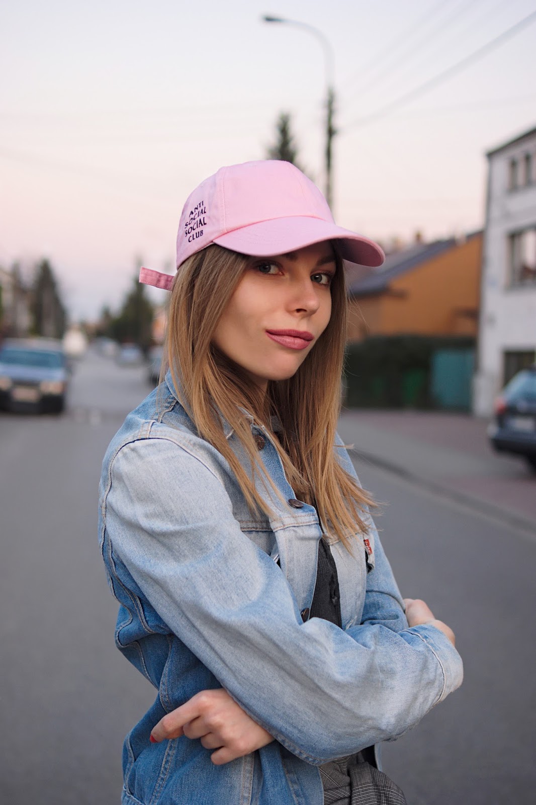 Jeansowa kurtka psuje do zwykłych szortów, spódnicy czy nawet sukienki w kwiaty. W dzisiejszej stylizacji postanowiłam zestawić ze sobą szarą spódnicę w kratę i ponadczasową, jeansową kurtką. Dopasowany top z ciekawym wiązaniem również wygląda tu świetnie. Nie mogłabym zapomnieć o tym, że ostatnio wręcz pokochałam styl athleisure. Łączy ze sobą wygodę i najmodniejsze elementy prosto z wybiegów. Sportowe buty i czapka z daszkiem bez wątpienia wpisują się w ten modny ostatnio trend.