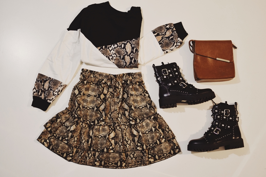 Jeden print zestawiony z czernią, a efekt całkiem ciekawy. Bluzę i spódniczkę znajdziecie w sklepie odzieżowym Bon Prix. Do tego zestawu proponuję krótką puchową czarną kurtkę i czarne grubsze rajstopy. Z pewnością będziecie wyglądać bardzo oryginalnie.