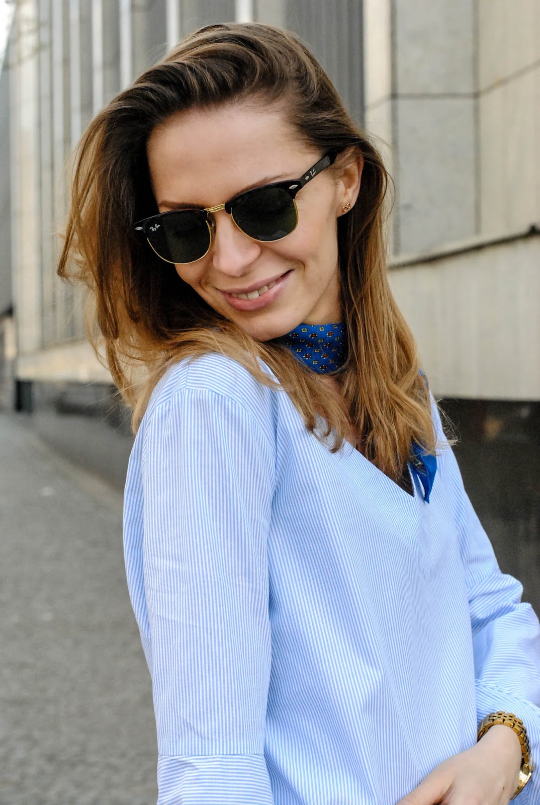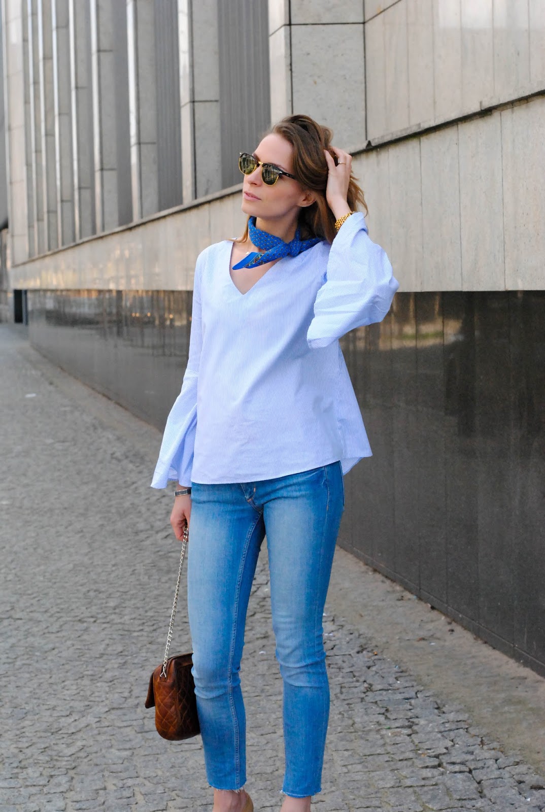 Look w stylu lat 70. to moja propozycja na wiosenne przywitanie majówki. Całość zestawu w odcieniach błękitu podkreśla gorący dodatek tego sezonu - niebieska apaszka.