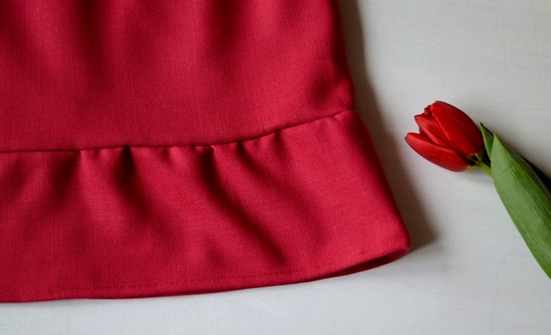 Marszczymy falbankę i przyszywamy do dołu spódniczki (obie części przykładamy do siebie prawymi stronami)