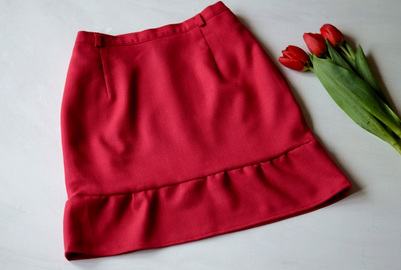 - prosta spódnica do kolan lub trochę za (musi być o ok. 2 rozmiary większa, żeby można było zrobić falbankę)
