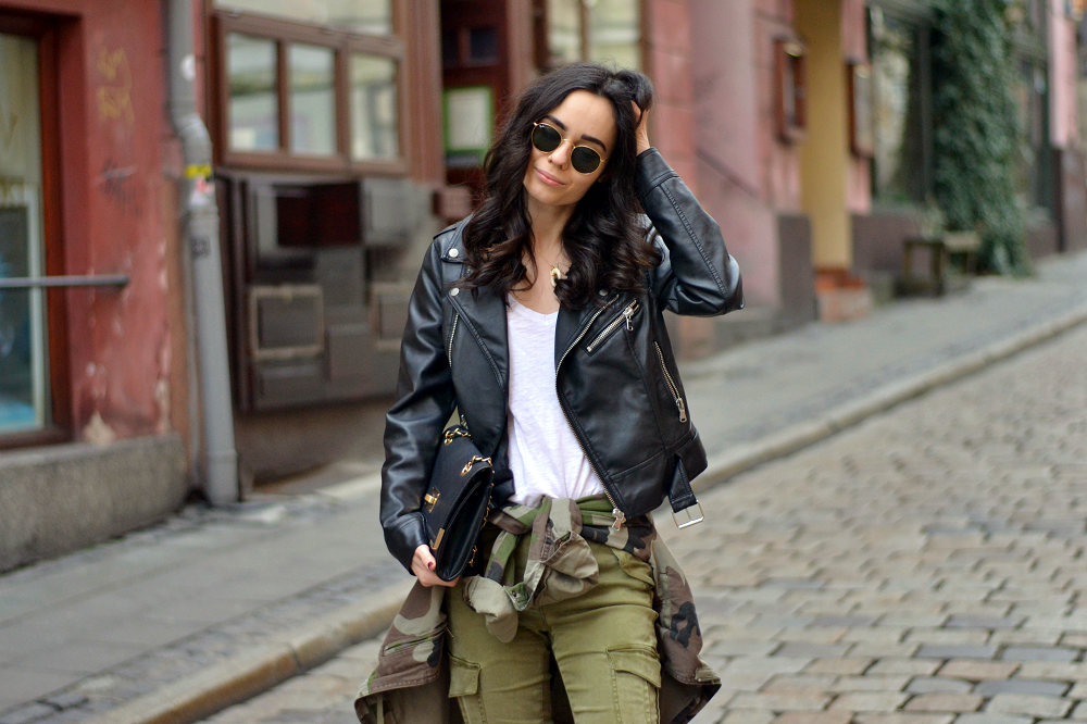 BENETTON top | H&M pants | GINA TRICOT faux leather jacket | CUBUS camuflage jacket | NEW LOOK bag | RAY BAN sunglasses | NIKE sneakers