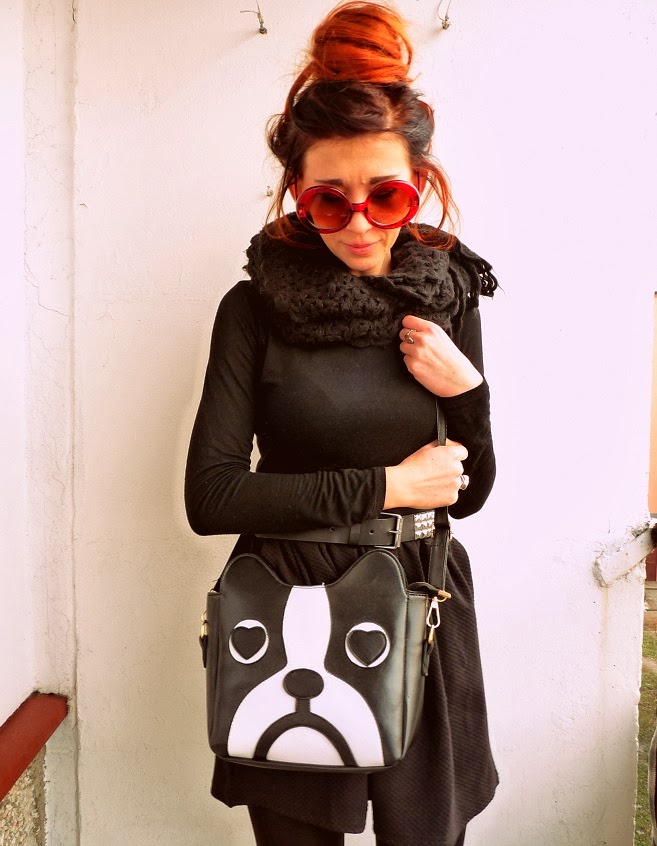 Postawiłam dziś na prostotę. Jedynymi dodatkami są pasek z nitami wyłowiony w lumpeksie i torebusia szczeniaczek (prezent od Micha).