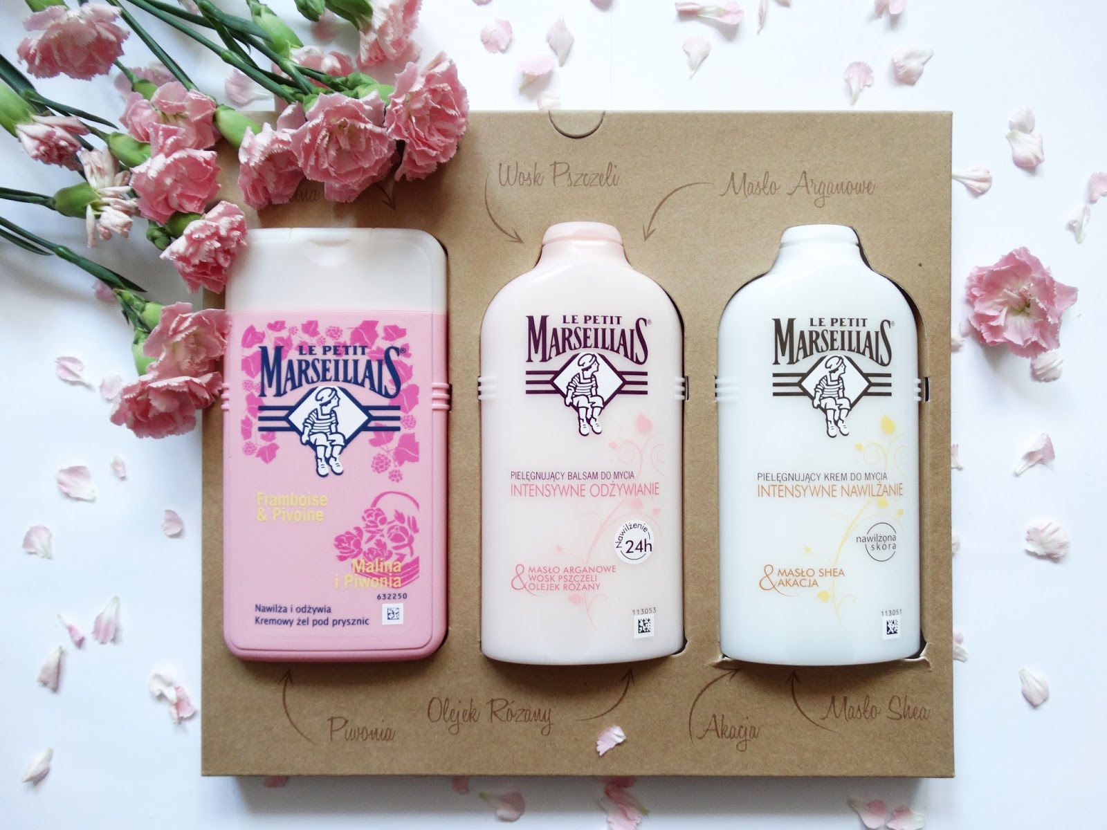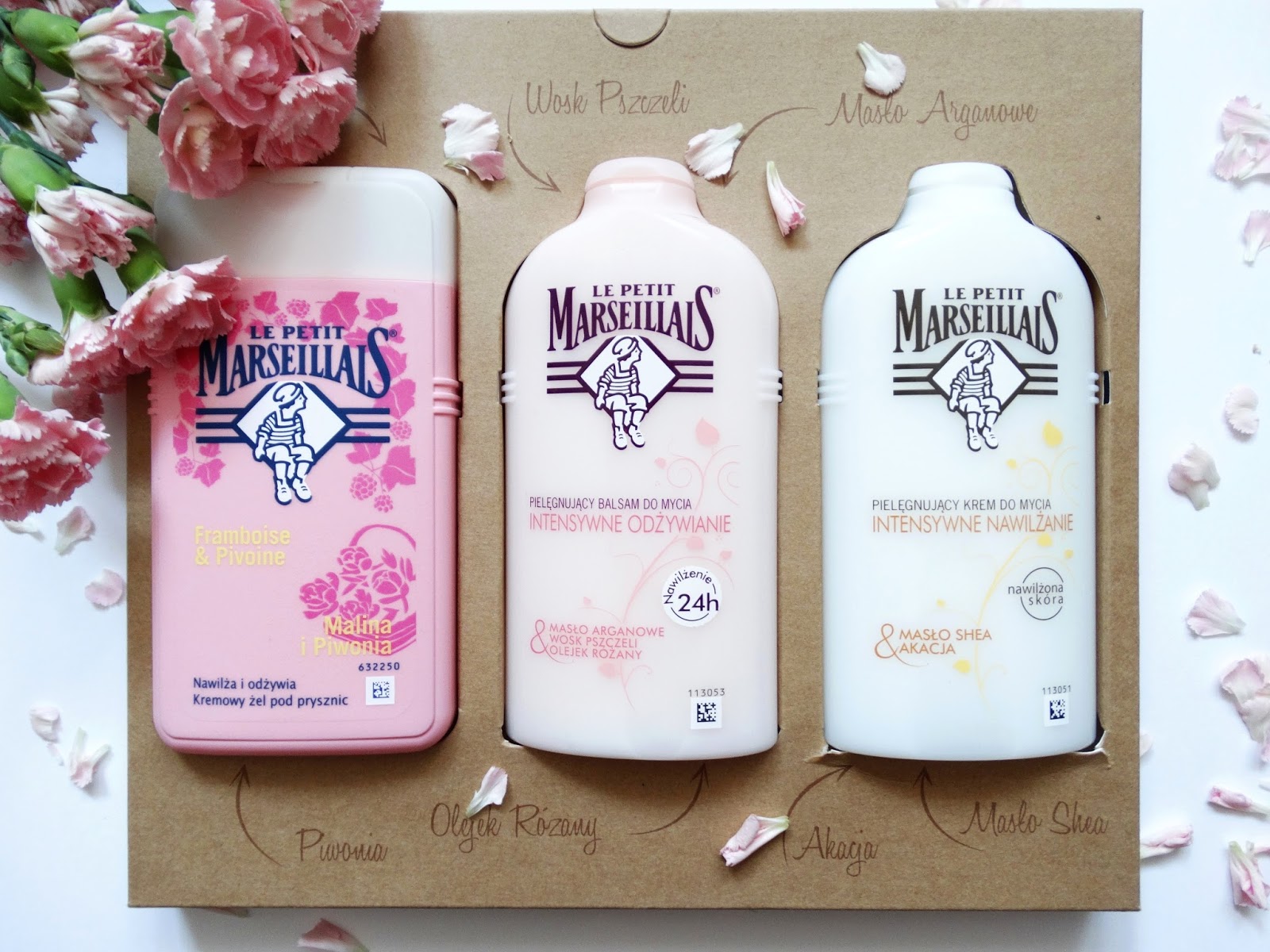 Tym razem miałam przyjemność przetestować trzy kosmetyki: kremowy żel po prysznic malina i piwonia, pielęgnujący balsam do mycia z masłem arganowym, woskiem pszczelim, olejkiem różanym oraz pielęgnujący krem do mycia z masłem shea i akacją.