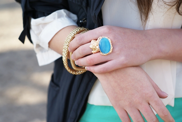 Zobacz oryginał wt., 20/03/2012 - 16:35Nad dzisiejszym strojem myślałam już od dłuższego czasu i ciągle mi coś nie pasowało. W końcu zdecydowałam się na najprostszą kompozycję. Połączyłam mocno miętowe rurki (może na zdjęciach wyglądają bardziej na błękitne, ale w rzeczywistości są inne) z czernią, złotem i kolorem kremowym. Wyszło delikatnie i zdecydowanie tak jak chciałam. Jestem zachwycona nową bluzką od Romwe, jest naprawdę śliczna i trafia na listę moich ulubionych rzeczy :) Pogoda jest już bardzo ładna, więc skorzystałam z okazji i założyłam sandały na koturnie, które również przypadły mi do gustu (chociaż są meeega wysokie ;P). Mam nadzieję że się wam spodoba! :)