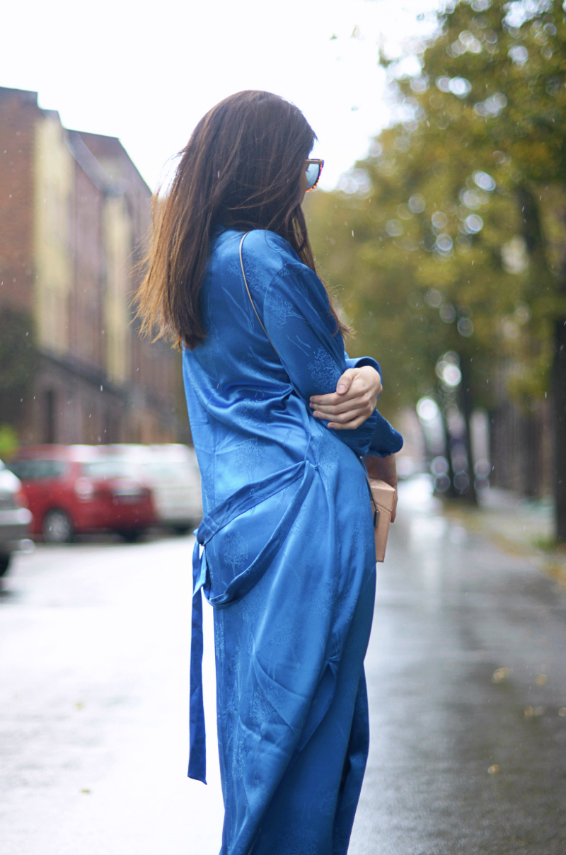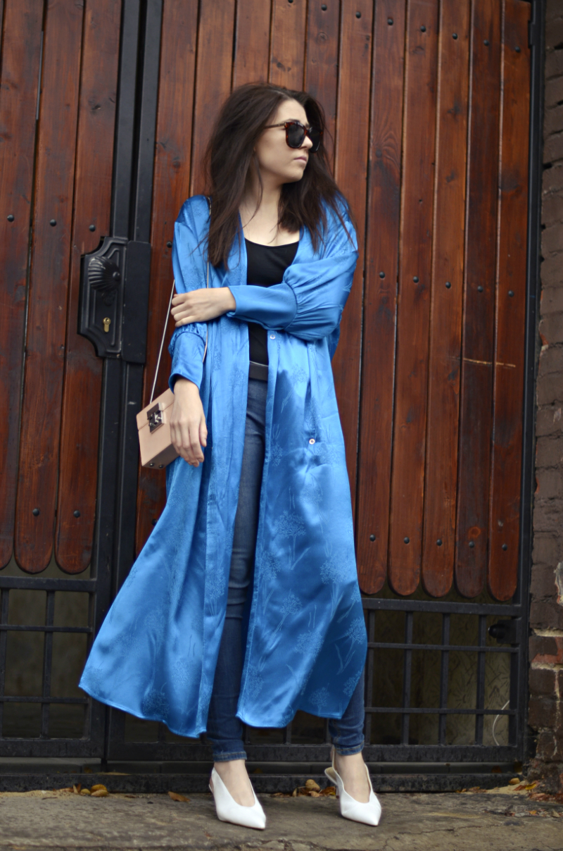 Zobacz oryginał ndz., 24/09/2017 - 22:21Rozmowy o pogodzie stanowią domenę nudziarzy, nie sposób jednak przemilczeć to, co wyprawia się za naszymi oknami od kilku tygodni. Jeżeli jest tutaj ktokolwiek, kto mimo permanentnych ulew i absolutnego braku promieni słonecznych opiera się jesiennej chandrze - składam wyrazu podziwu! Abstrahując od nastroju i komfortu życia w czasie pory deszczowej (zamówiłam już nawet pierwsze w mym życiu kalosze ;)), fotografowanie outfitów to nie lada wyzwanie. Sesja z błękitnym "szlafrokiem" zrobiona w deszczu i w okropnym pośpiechu czeka na swoją premierę już kilka dni, w czasie których to czyhałam na lepsze warunki i okazję do powtórki. Niestety nie doczekałam się, ale postarałam się wybrać kilka w miarę znośnych ujęć. Błękitny "szlafrok" to sukienka, która okazała się być ze dwa rozmiary za luźna i za długa, aby spełniać swą pierwotną rolę. Tymczasem namiętnie rozglądam się za jesienno - zimową garderobą. Spodziewajcie się więc posta z propozycjami swetrów, kurtek i butów!