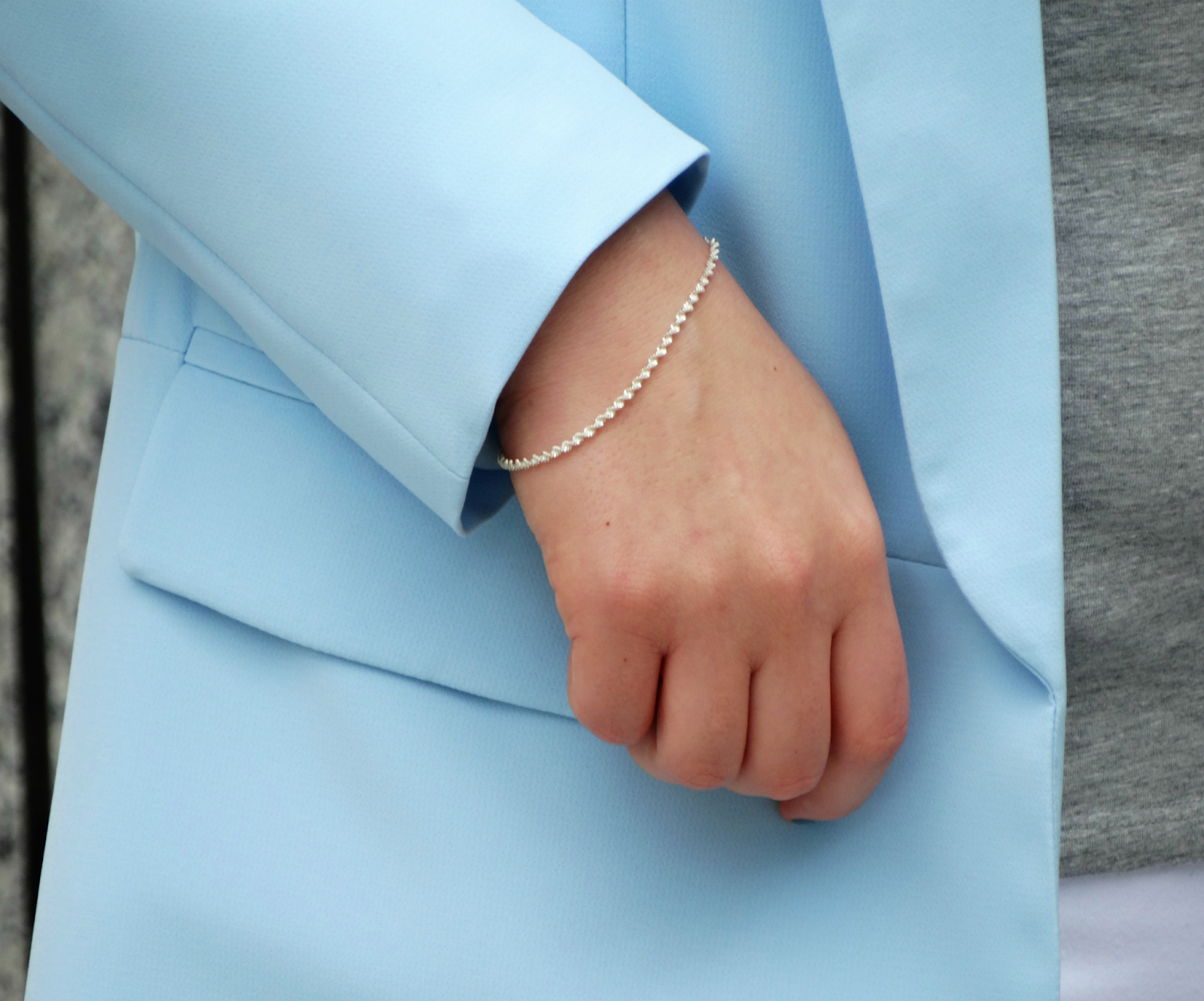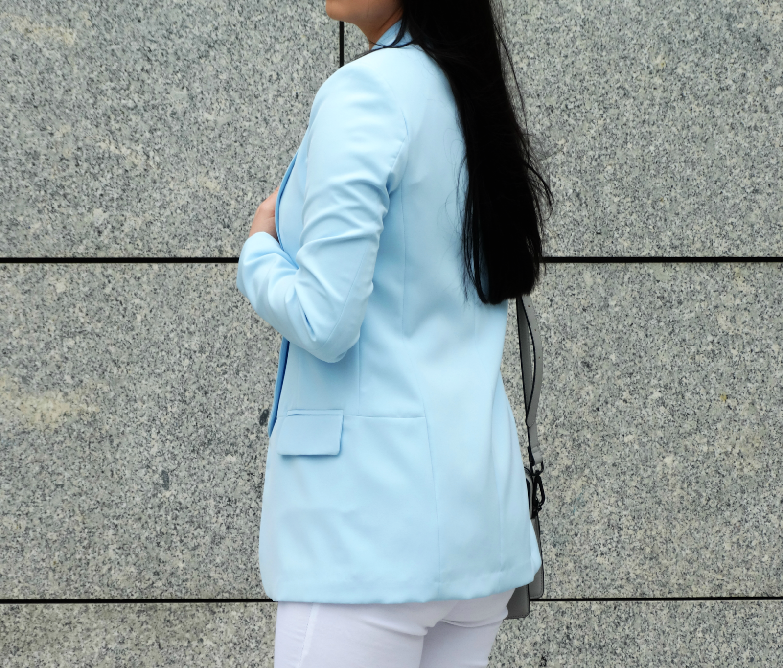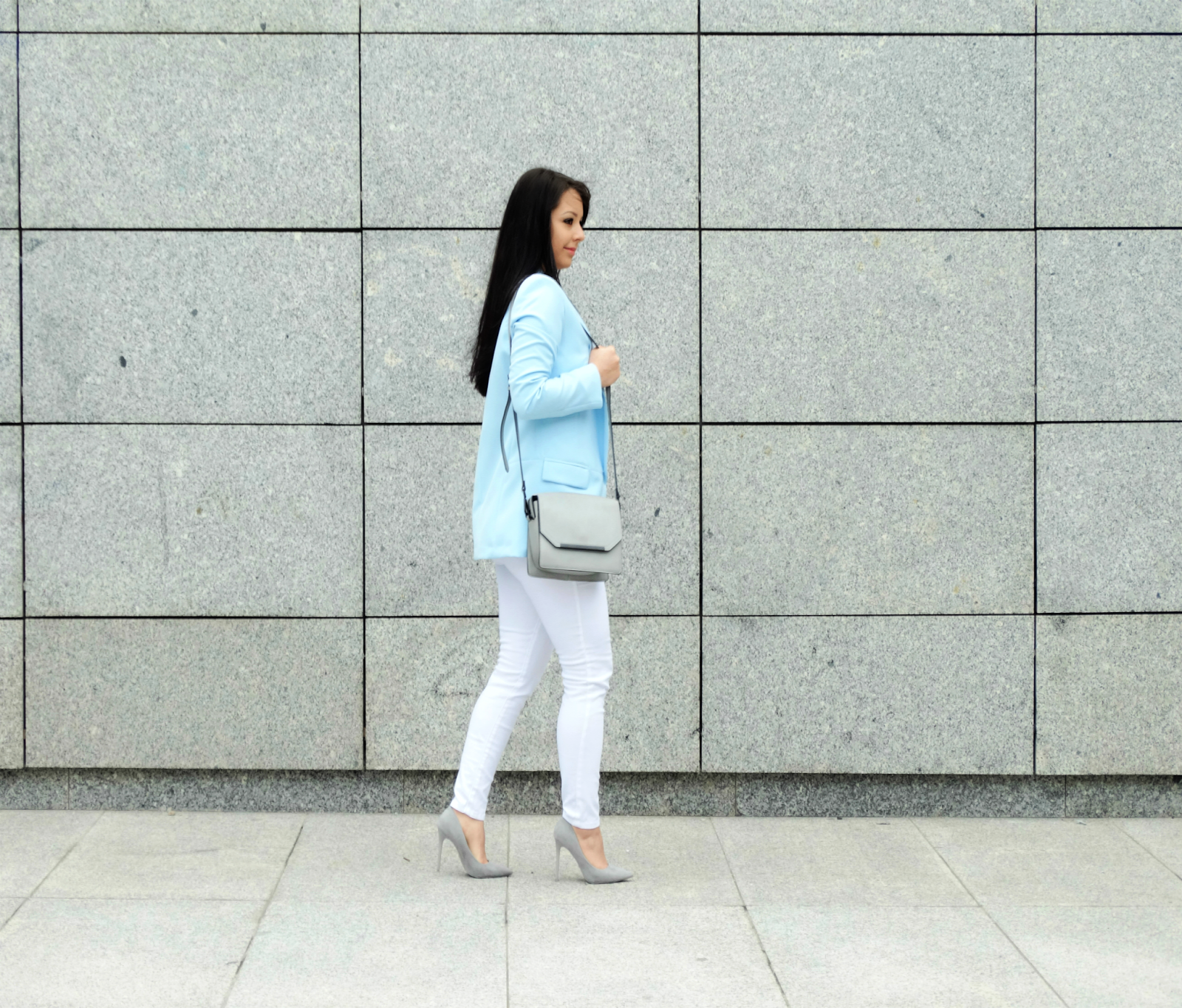 Zobacz oryginał wt., 09/08/2016 - 20:54 Witajcie! W dzisiejszym zestawie pierwsze skrzypce gra błękitna marynarka. Ubrania w kolorze baby blue już kilka razy pojawiły się na moim blogu (tutaj). Muszę przyznać, że ten delikatny i subtelny odcień niebieskiego lubię najbardziej. Błękitny bardzo korzystanie wygląda w połączeniu z szarościami i bielą i na te właśnie barwy postawiłam w dzisiejszym zestawie. Marynarkę połączyłam z klasyczną szarą bluzką oraz białymi spodniami, cały zestaw uzupełniony jest szarymi dodatkami. Co myślicie o takim połączeniu?