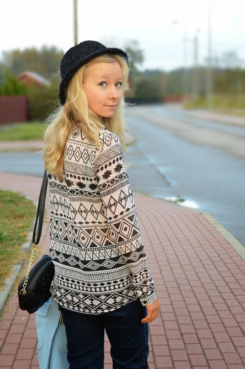 Dzisiejsza stylówka to coś, w czym czuję się najlepiej. Wygodne dżinsy, do tego koszula w etniczny motyw i pastelowy płaszcz z sheinside.com. Bardzo go lubię, bo pasuje zarówno do eleganckich, jak i codziennych połączeń, a swoją delikatną barwą wyróżnia się wśród szaro-burej jesiennej tonacji :) No i nie ma co ukrywać, z moim wyglądem w pastelach czuję się jak ryba w wodzie! W dniu zdjęć było jeszcze w miarę ciepło, zrezygnowałam więc z szalika w jego miejscu ożywiając płaszcz wzorzystym kołnierzykiem. Oby jeszcze choć na kilka dni podniosły się słupki termometrów...