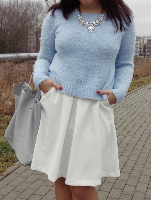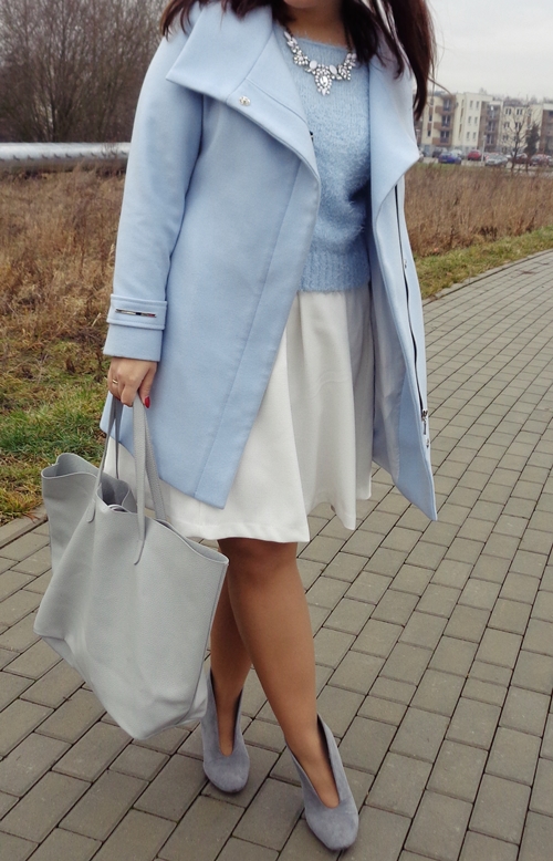 Zobacz oryginał pt., 30/12/2016 - 20:28 Nie zdawałam sobie sprawy z tego, że ciągle ubieram się w ciemne kolory dopóki nie doświadczyłam reakcji najbliższych na ten biało niebieski zestaw. To zaskoczenie dało mi do myślenia :) Staram się przemycać w stylizacjach pastele, jednak nie jest to łatwe zimą. Lubię spódnice, jednak od października do marca noszę do nich czarne kryjące rajstopy. Samo to narzuca już jakiś reżim kolorystyczny. Postanowiłam więc choć raz zerwać z tym schematem i skorzystać z tego, że mieliśmy bardzo niezimowe Święta :) Fantastycznie czułam się w tym zestawie. Jak wam się podoba?