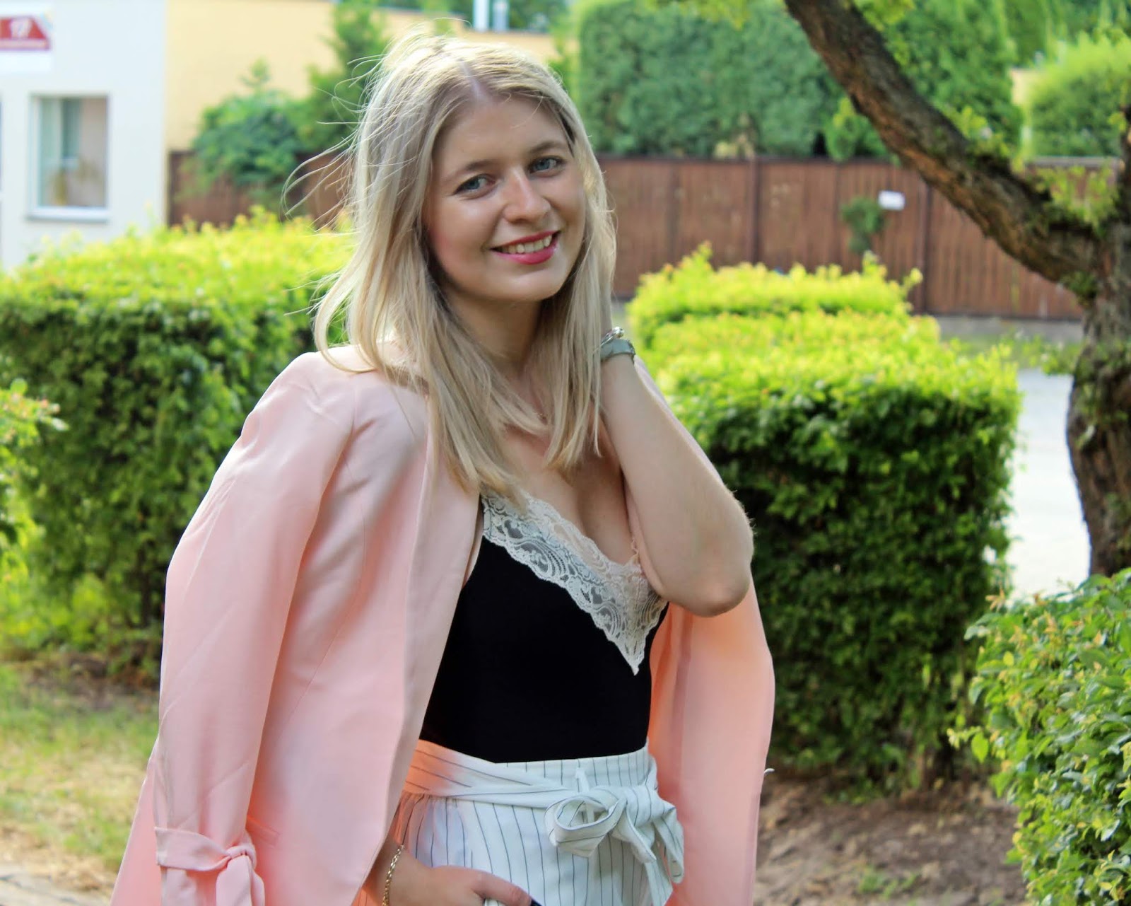 Tym razem zestawiłam je z białymi, szerokimi spodniami od SheIn i pudrową marynarką BonPrix.