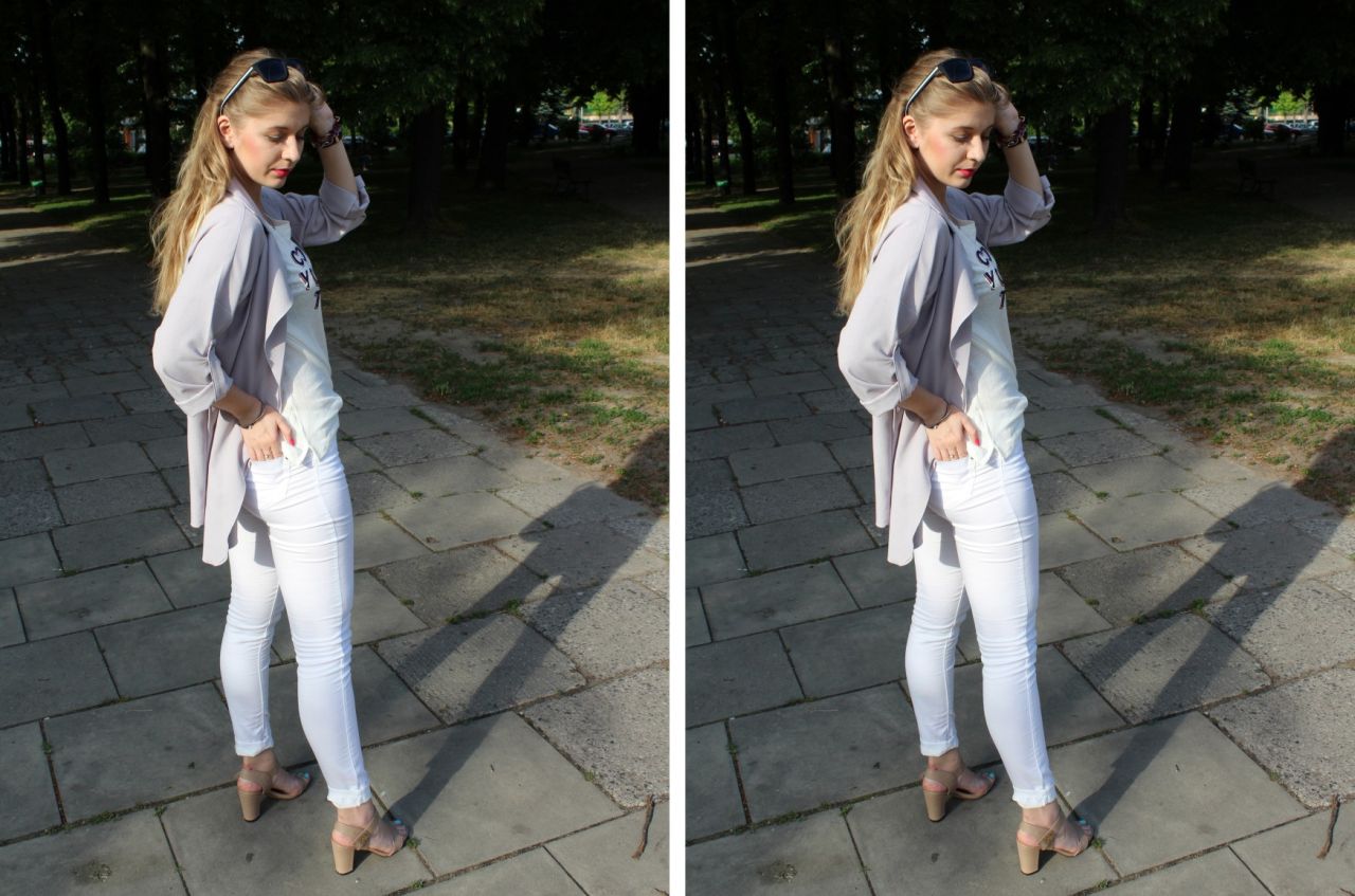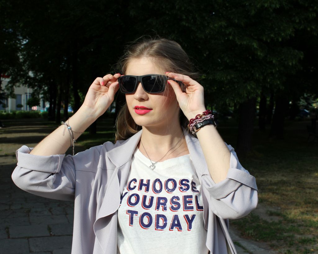 Do tego wspomniane wcześniej cieliste dodatki, czyli sandałki i worek od Super-dodatki. Dodatkiem, są również okulary przeciwsłoneczne eOkulary, model uniwersalny z ozdobnymi białymi paskami na bokach, dzięki czemu wpasowują się w cały look. Subtelna biżuteria to zegarek Mockberg i dwie piękne bransoletki od X Jewellery. Idealnie pasują do siebie kolorystycznie i są jednymi z moich ulubionych ;) Bardzo fajne jest w nich to, że same możemy sobie wybrać to w jakim kolorze będzie nasz łańcuch i jakie linki w nim się znajdują.