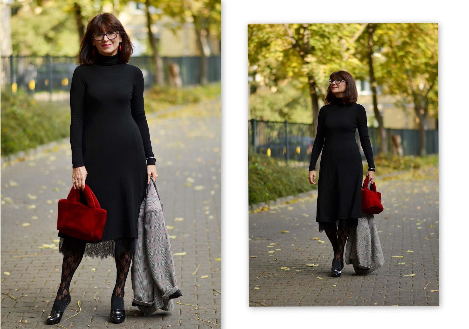 Z dodatkami spokojnie: czerwone kolczyki, delikatna, srebrna bransoletka i czerwona, futerkowa torebka. Jedynym szaleństwem, jeżeli w ogóle, to koronkowe rajstopy :)