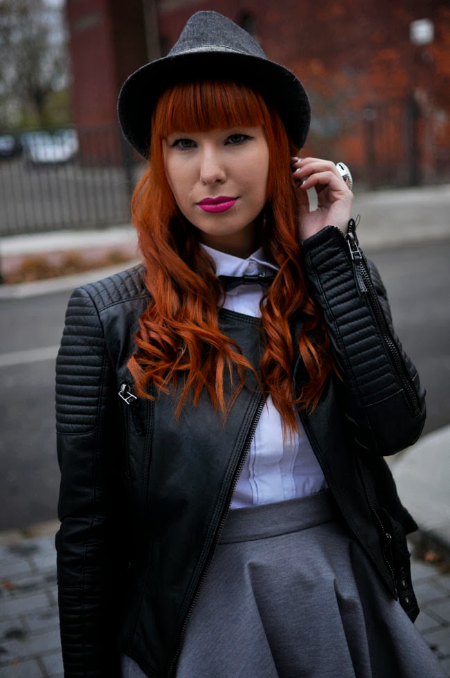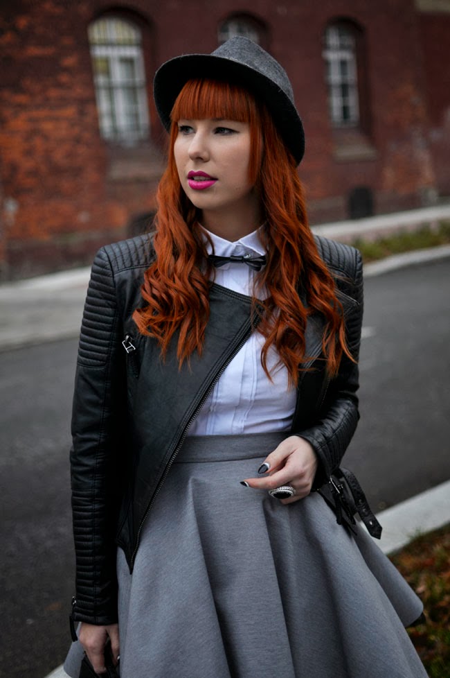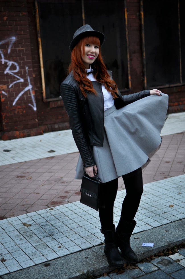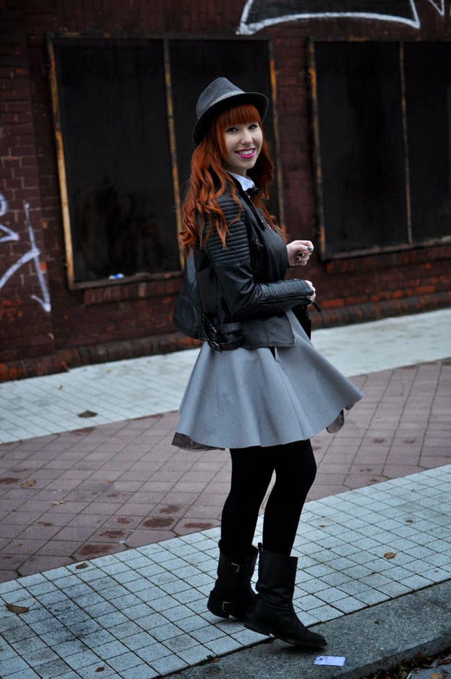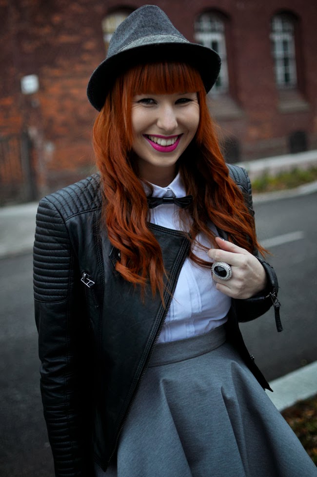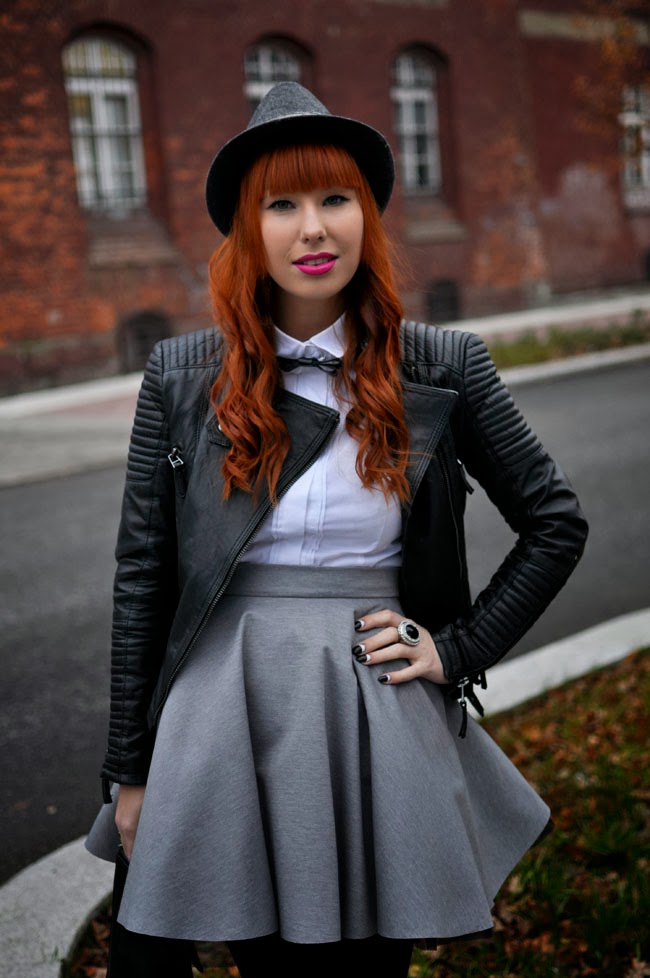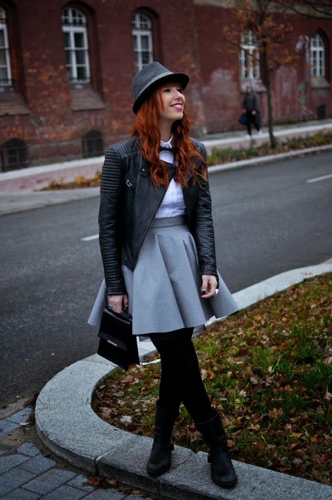 Zobacz oryginał pon., 25/11/2013 - 14:23Ostatnio pokochałam spódnice z koła. Jedna z "tych" towarzyszyła mi na Fashion Weeku, ale o tym następnym razem. Dziś prezentuję Wam kolejną z mojej kolekcji. Zakochałam się w niej od pierwszego wejrzenia. Jest uszyta ze wspaniałego miękkiego materiału, a zasługą jej formy jest tiulowa podszewka. Dzięki niej spódnica świetnie się układa, a jej kształt jest nienaganny. Postawiłam na klasykę w postaci białej koszuli i czerni. Styl uczennicy jest mi ostatnio bardzo bliski- he! Jako, że nie do końca utożsamiam się z mundurkiem szkolnym, wybrałam mocne, skórzane buty i kurkę, które nieco przełamują ten rzeczny look. Zabawna mucha pod szyją jest nawiązaniem do przedszkolnych kokardek- nie wiem czy je nosiliście, ale Atomek opowiadał, że były jego zmorą, a mama z uporem maniaka wiązała mu je na szyi przy każdej przedszkolnej okazji. Kapelusz dopełnia stylizację i... odrobinę chroni moją czuprynę przed kroplami mżawki.
