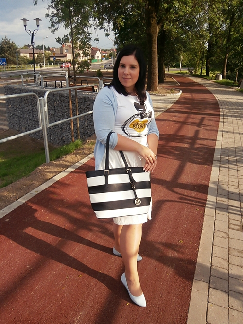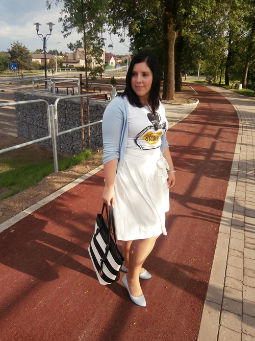 Mam ten przywilej, że mimo pracy w banku, mogę dosyć swobodnie się ubierać na co dzień. Nie mamy kontaktu z klientami więc nikomu nie przeszkadza, gdy podczas upałów ktoś ubierze letnią sukienkę czy sandały. Ja w zeszłym tygodniu po raz drugi postawiłam na białą spódnicę z efektowną kokardą, a do tego błękitne dodatki i torba w pasy.