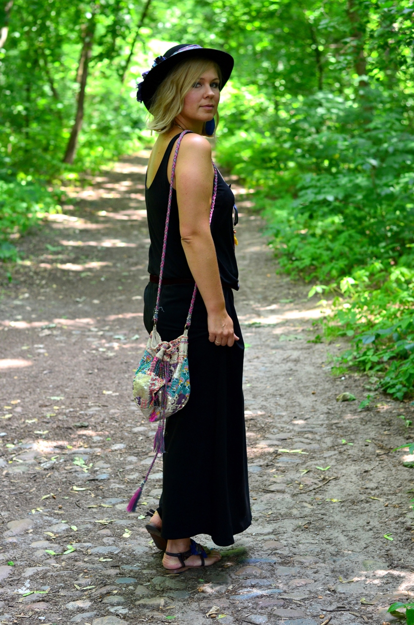 Zobacz oryginał śr., 17/07/2013 - 18:19 Bardzo lubię styl boho. Daje mi namiastkę wolności i przywodzi na myśl wakacyjny i wolny od trosk czas. Czarną wygodną sukienkę H&M (ciucholand) przepasałam bordowym paskiem. Do takiej bazy zakładamy na szyję kolorowe naszyjniki bądź bransoletki. Ja dodatkowo założyłam kolczyki-piórka. Kolorowa, wyszywana torba-worek z Accessorize świetnie dopełnia ten look. Nie mogło zabraknąć sandałków w orientalnym stylu. W takim stroju można spędzić leniwą sobotę ze znajomymi lub udać się na letni koncert.