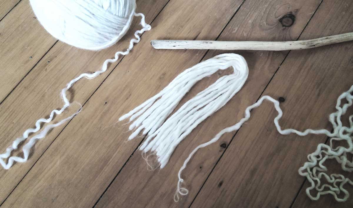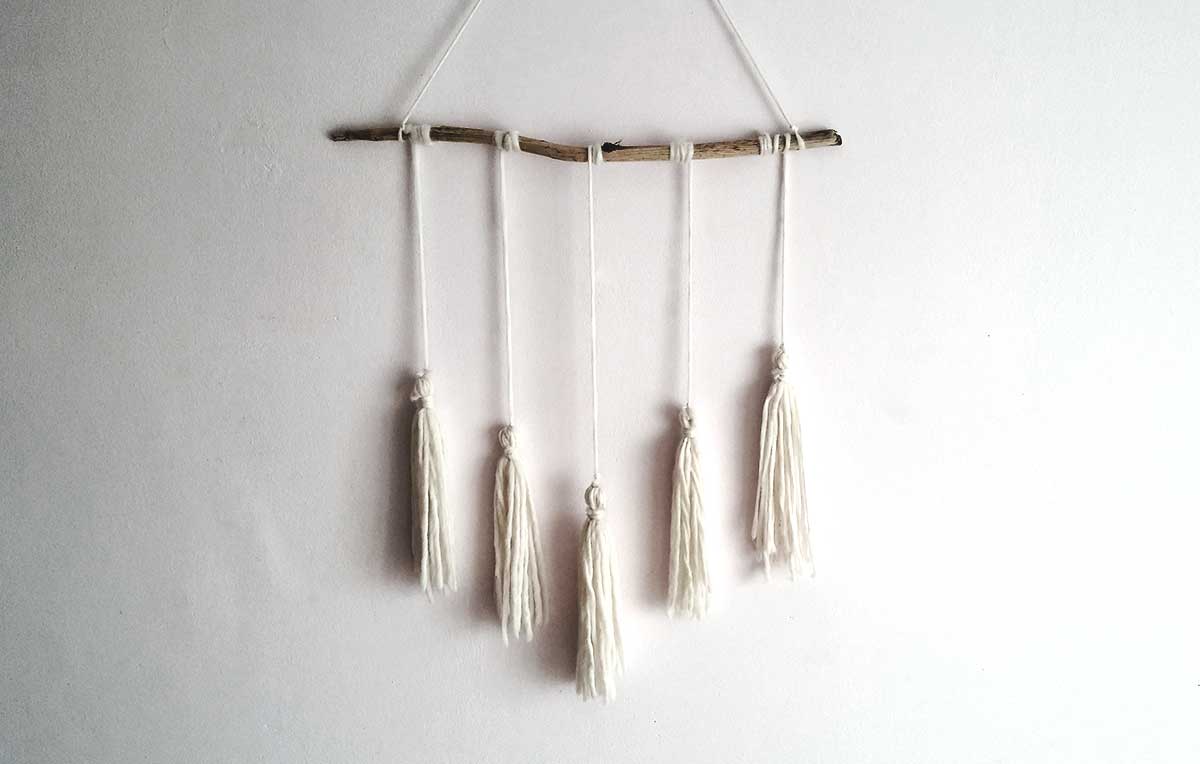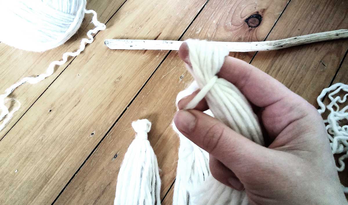 Na początku przygotowałam drobne kawałki włóczki o długości około 30 cm. Złożyłam je na pół i przewiązałam tworząc chwosty. Następnie zawiesiłam je za pomocą włóczki do gałęzi.