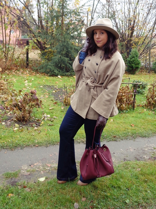 Zobacz oryginał pon., 21/11/2016 - 20:01Czy też tak macie, że po zakupie jakiejś wyjątkowo fajnej rzeczy musicie ją założyć już, natychmiast? Ja tak mam cały czas. Gdy przychodzi paczka z wyczekiwaną spódnicą, trafia ona od razu do prania, a ja obmyślam stylizację na następny dzień. Podobnie, gdy kupię sobie nową torebkę. Wymyślam cały zestaw pod nowy zakup. Nie inaczej było z bordową torebką kupioną całkiem niechcący podczas zakupów z Pauliną. Miałam tylko doradzać przy wyborze botków, a chwilę później wylądowałam przy kasie z torebką w ręku. Co prawda mówiłam, że krój sakiewki już mi się przejadł, ale od dawna marzyłam o nowej bordowej torebce (starą odsprzedałam bo właściwie jej nie nosiłam), a ta była o wiele ciekawsza od zwykłego kuferka. I wcale nie taka droga, jak się spodziewałam. Naturalnie nie wzięłabym jej, gdyby nie miała długiego paska na ramię. Na pierwszy ogień jednak poszła bez niego, w stylizowanym na retro zestawie z dzwoniastymi spodniami i płaszczem typu kimono.