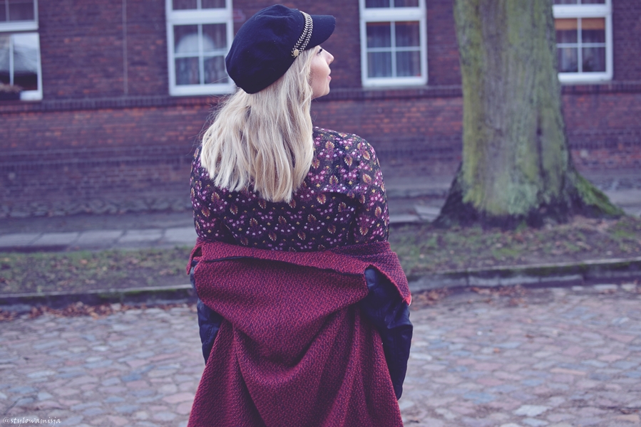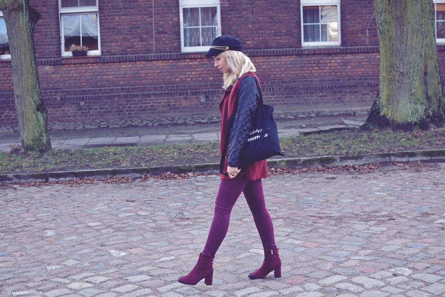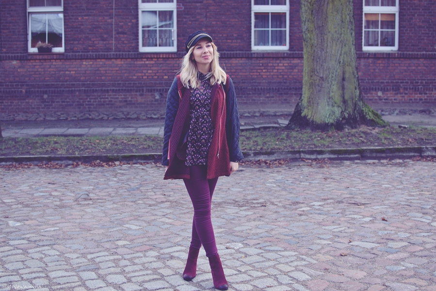 Bordowe spodnie wpadające w fiolet i pasująca do nich szyfonowa bluzka okazały się być ciekawym połączeniem. Całość tworzy fajny dzienny klimat, a torba shopperka i blogerska czapka idealnie dodają tej stylizacji charakteru. Płaszczyk, a raczej narzutka z pikowanymi rękawami w czarnym kolorze to oczywiście tylko propozycja na cieplejsze dni. Kiedy zima poważnie zapuka nam do okien, warto odziać się wtedy w cieplejszy płaszcz. On również będzie pasował.
