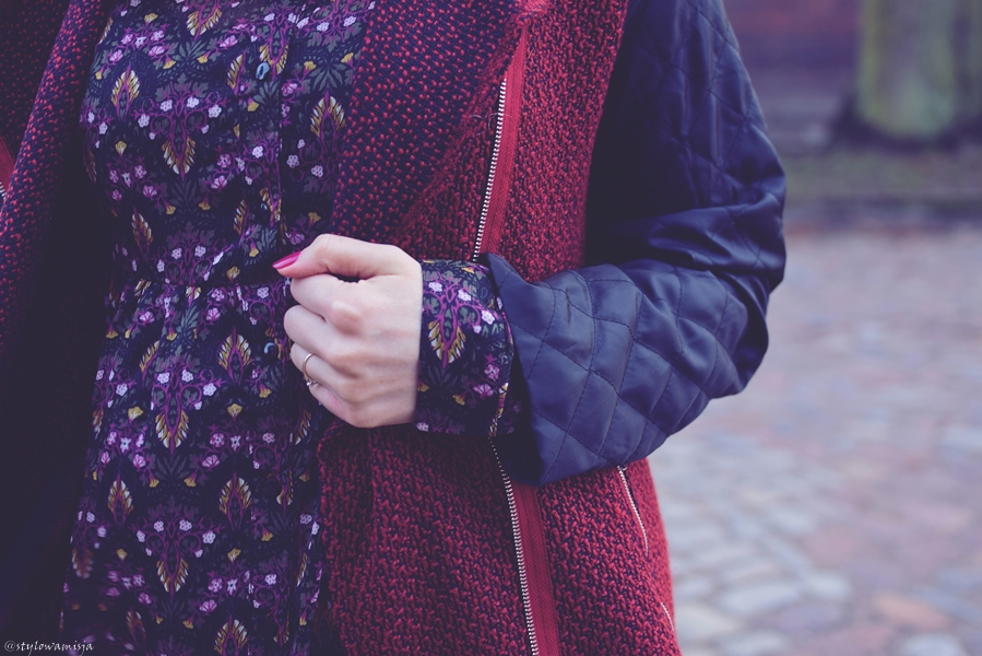 Dziś stylizacja, która powstała przypadkiem. Bordowe botki z metalowymi kółkami z tyłu mam już od jakiegoś czasu i muszę przyznać, miałam z nimi mały problem. Mimo, że zakochałam się w nich od pierwszego założenia, połączenie ich w interesujący sposób nie było łatwe. Nie miałam pojęcia z czym połączyć te buty. Przy okazji wizyty w Auchan przypadkiem trafiłam na dział odzieżowy i również przypadkiem (dziewczyny, wiecie jak to jest prawda?) skompletowałam sobie stylizację. Nigdy nie miałam okazji zajrzeć na dział z ubraniami, ponieważ zawsze podczas wizyt w Auchan skupiałam się tylko na zakupach spożywczych. Teraz z pewnością będę częściej skręcać w tamtą alejkę.