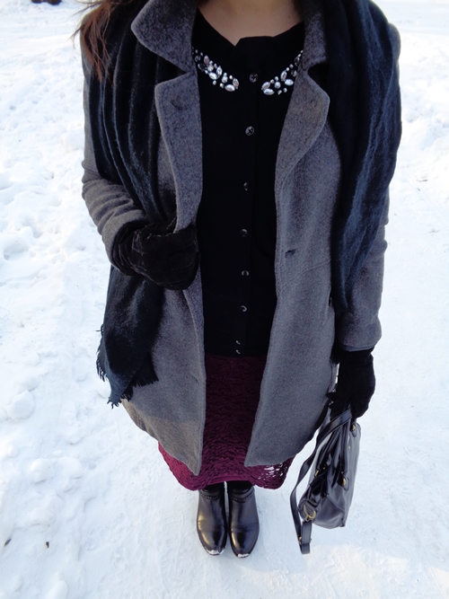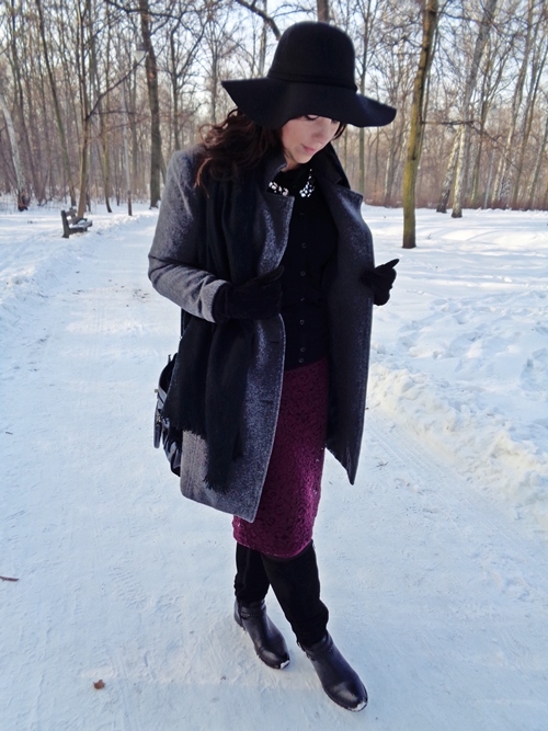 Poniżej przedstawiam ją w stylizacji z szarym płaszczykiem i kapeluszem. Jako, że ostatnio z mężem w niedziele robimy sobie długie spacery (min 7 km), musiałam ubrać płaskie, niezbyt eleganckie kozaki. Ale i tak mi się podoba ostateczny efekt :)