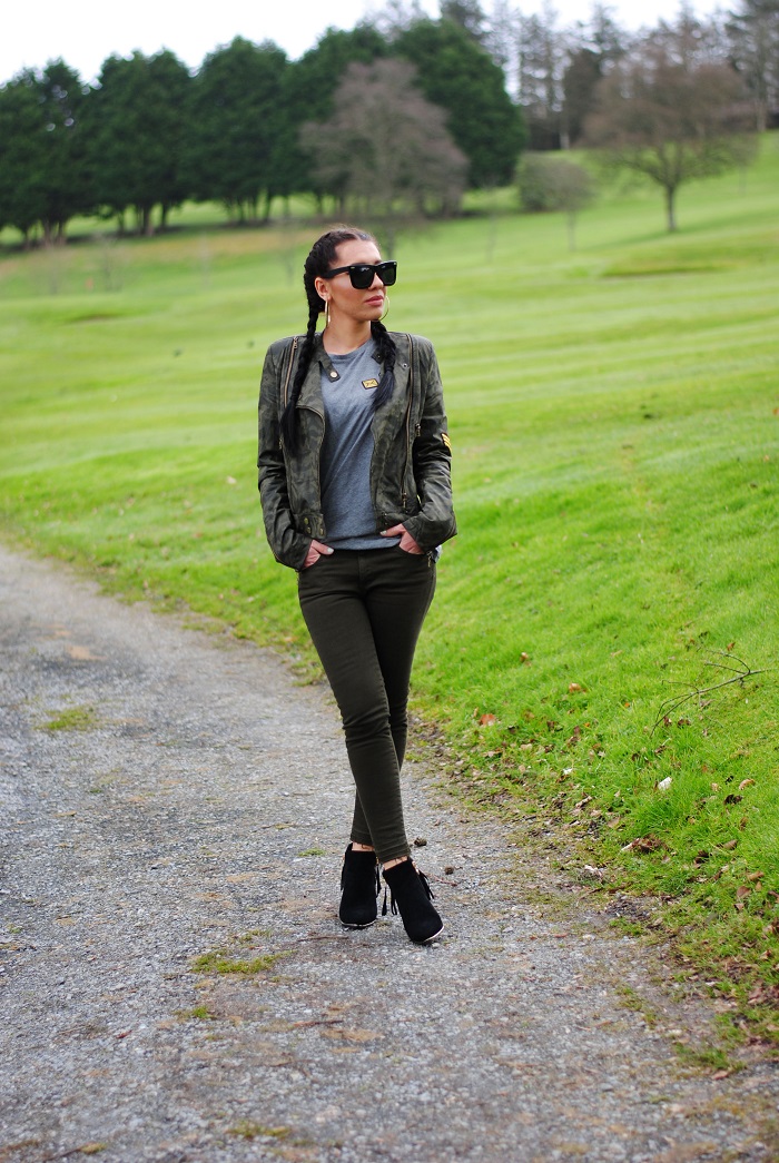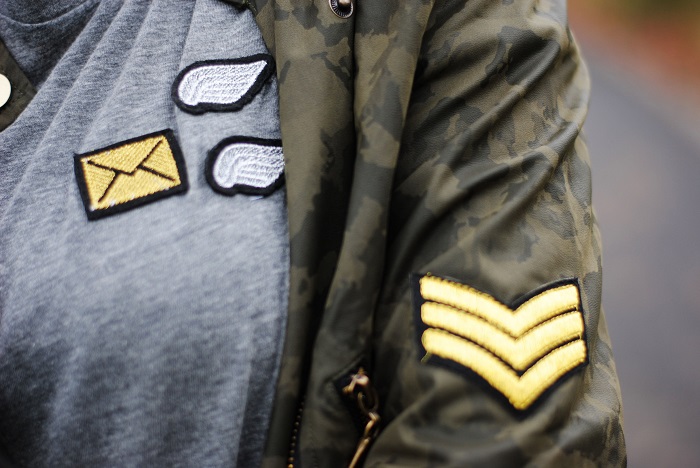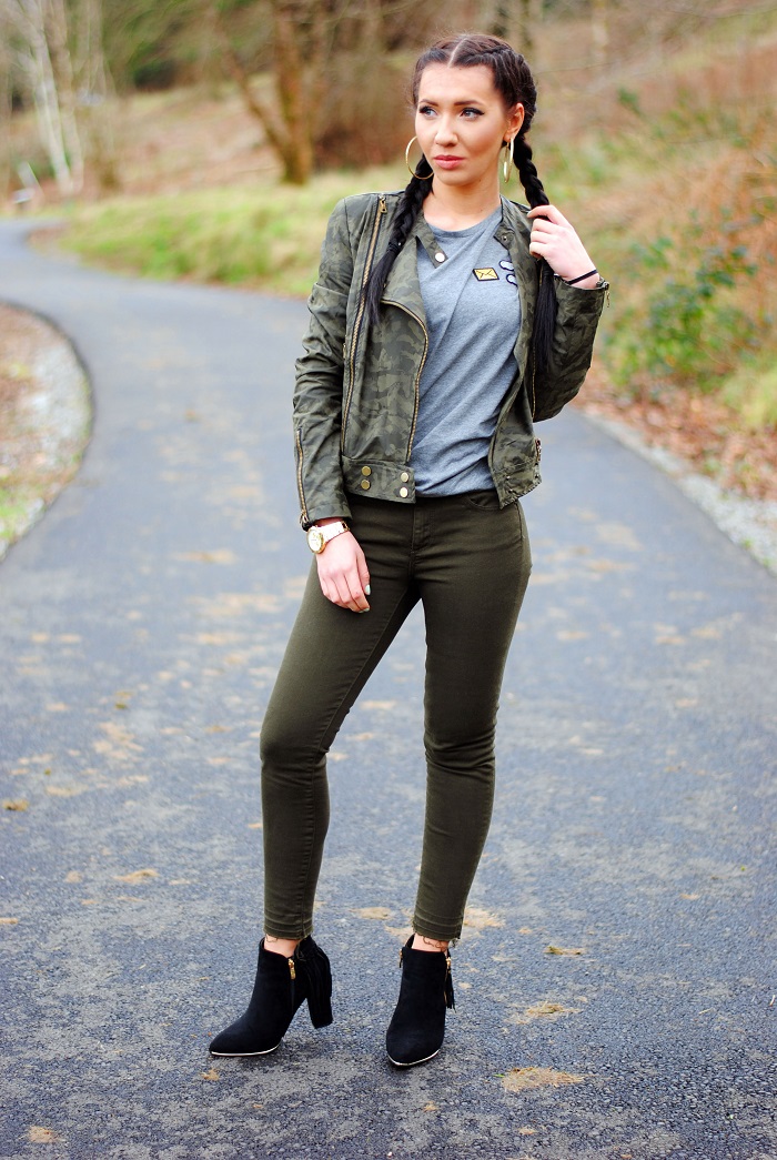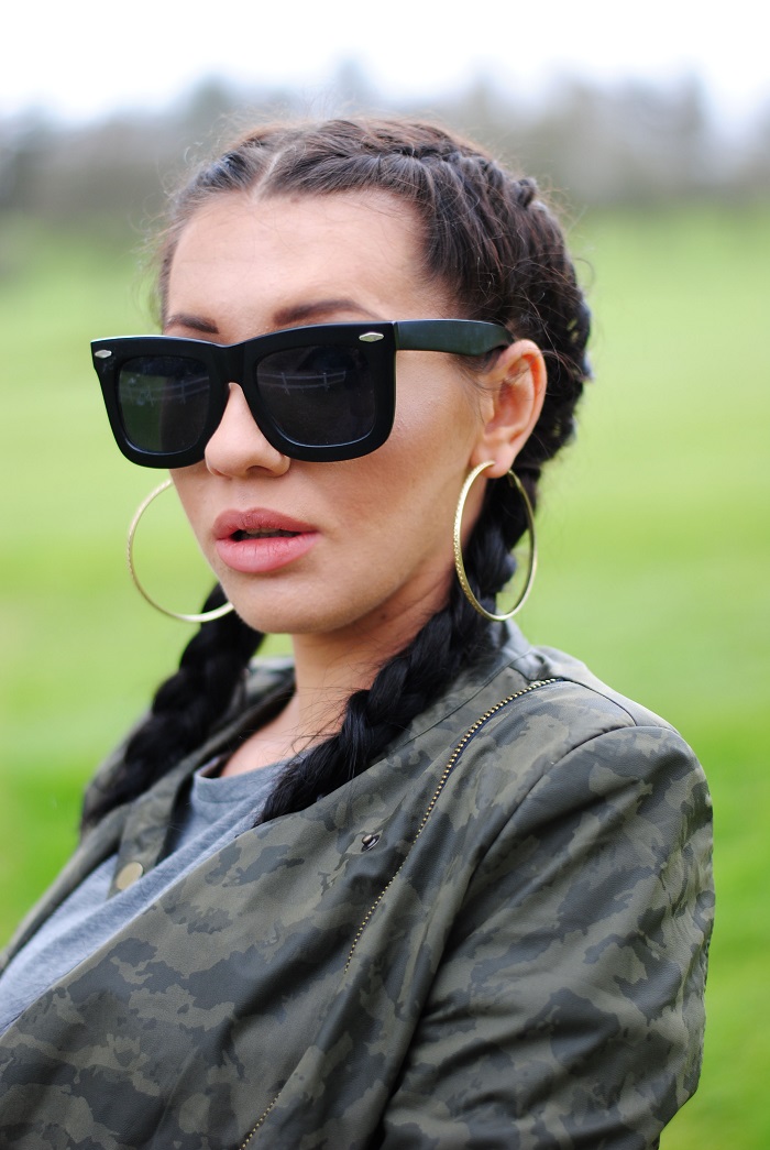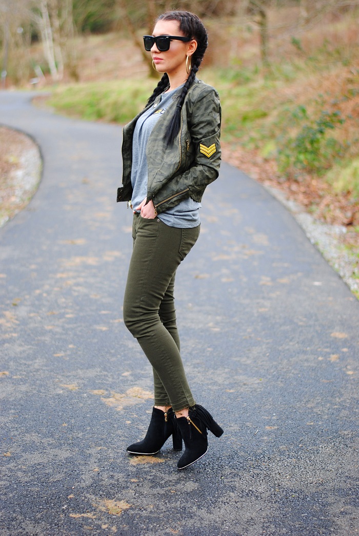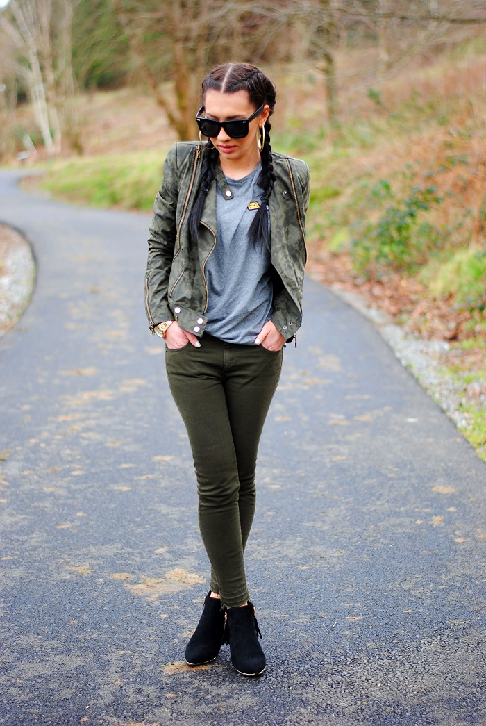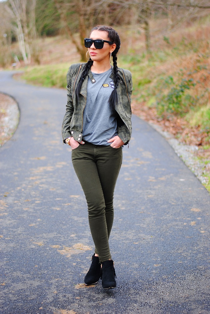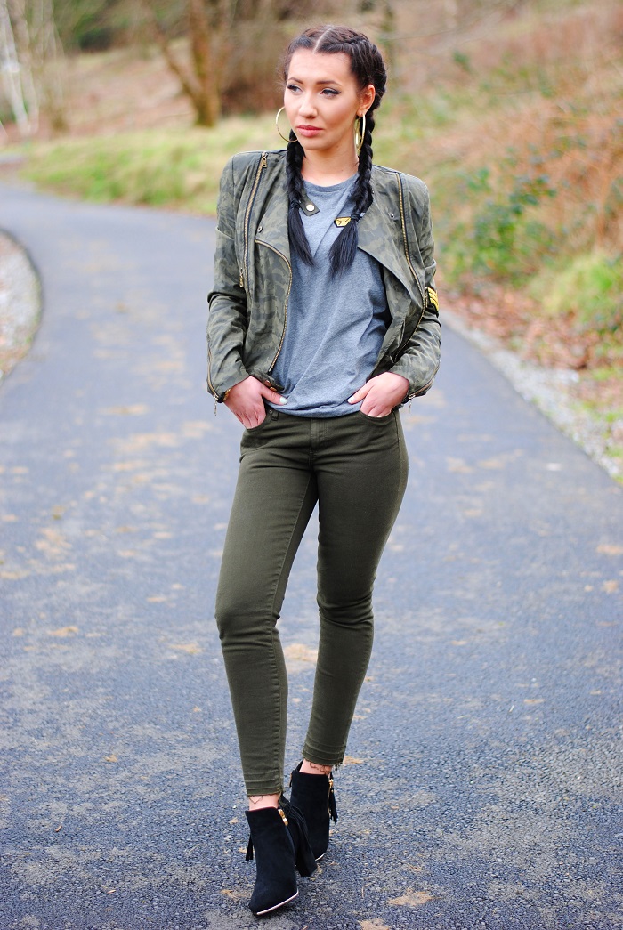 Zobacz oryginał wt., 08/03/2016 - 18:43Na początku bardzo chciałam Wam podziękować za wysokie statystyki ostatniego postu, zauważyłam że ostatnio jest was wszędzie coraz więcej, co bardzo mnie cieszy :) Jak zwykle wracam do was z kolejnym modowym postem, dziś postawiłam na kolor khaki. Wiele z Was pewnie wie że od pewnego czasu jest to mój ulubiony kolor (oprócz czerni :) i większość ciuchów które ostatnio kupuję są własnie w tym kolorze. Jakiś czas temu szukając kurtki która będzie idealna na wiosnę, znalazłam tą, dlatego że w szafie nie posiadam jeszcze żadnego okrycia wierzchniego z printem moro. Połączyłam ją z oliwkowymi rurkami z nogawkami 7/8, szarym t-shirtem z efektownymi naszywkami i zamszowymi botkami. Cały look dopełniłam dobieranymi warkoczami i dużymi kolczykami.