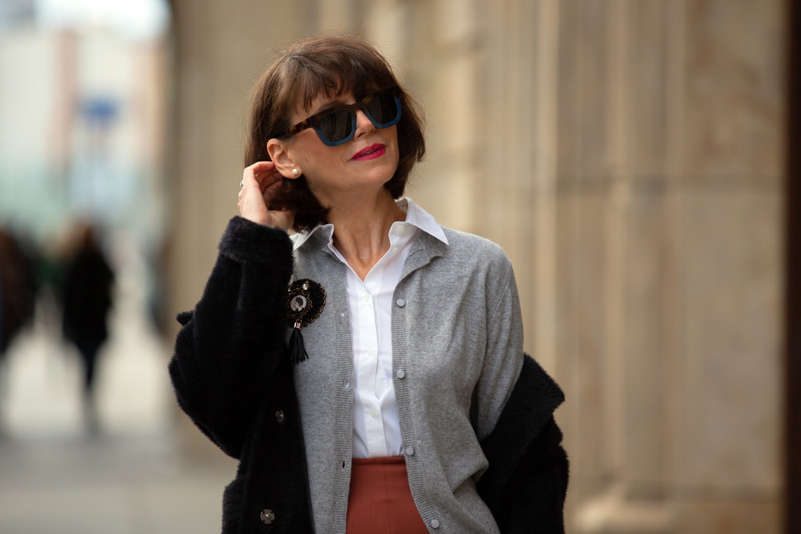 Idealny żakiet zastąpiłam idealnym sweterkiem. Delikatny, kaszmirowy kardigan w neutralnym, ale nie nudnym, popielatym kolorze to genialna alternatywa dla marynarki. Jednak trzeba pamiętać, że taki sweter żeby spełnił kryteria elegancji powinien być z surowców wysokiej jakości. Dlaczego? To proste, aby się nie mechacił! A to gwarantuje nam surowiec, z którego jest wykonany i kaszmir do takich surowców się zalicza.