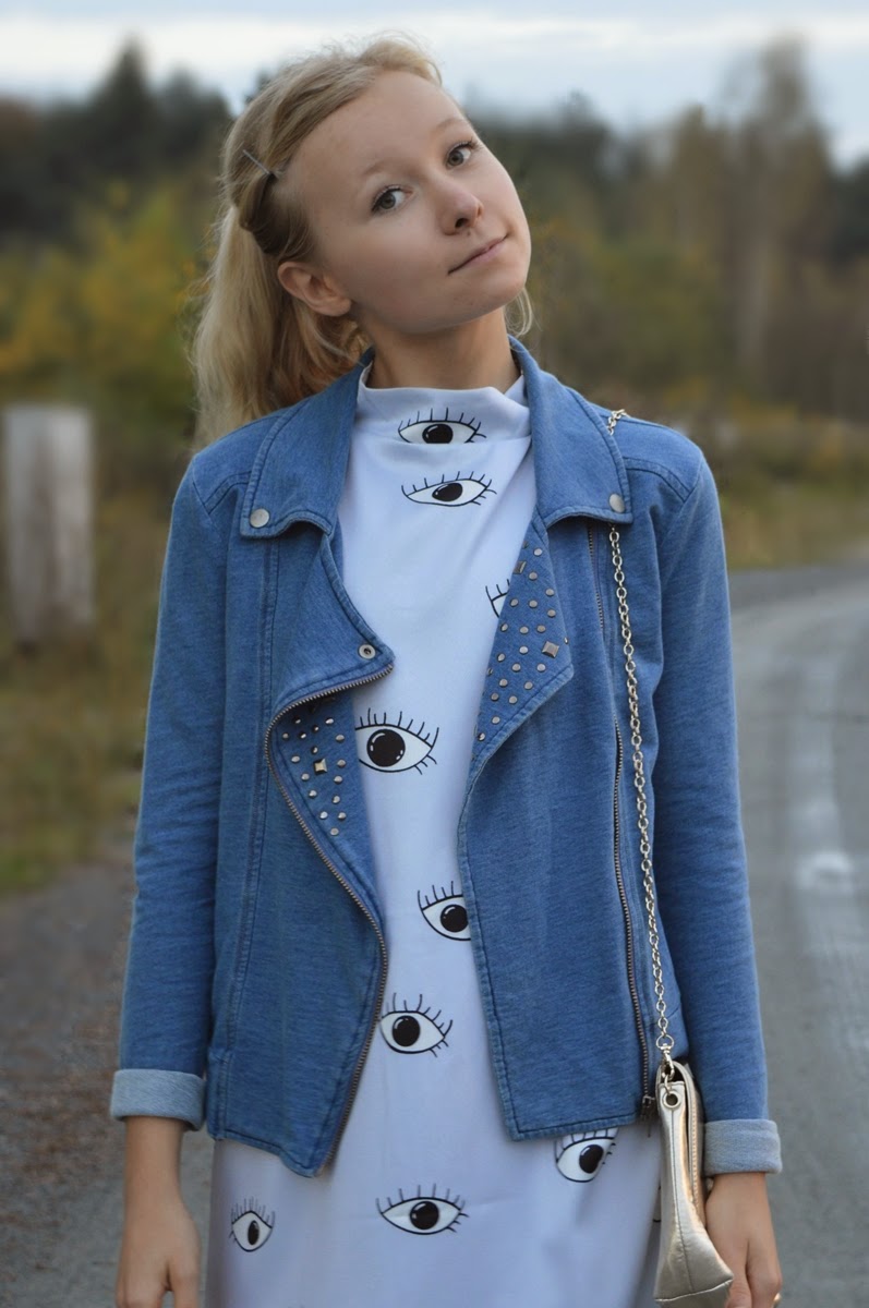 Zobacz oryginał pt., 24/10/2014 - 18:44Po dwóch tygodniach przerwy nareszcie nowa stylizacja :) Wybaczcie, ostatnio młyn w szkole mamy straszny, a już od poniedziałku zaczynamy kolejny trzytygodniowy maraton sprawdzianowy... Nie daję jednak za wygraną - niech się dzieje wola nieba, ale i blogować trzeba (ostatnio na polskim jak nie Mickiewicz to Słowacki, stąd chyba te niespodziewane rymy...). Po ładnym wrześniu i początku października nadeszła wreszcie jesień z prawdziwego zdarzenia. I chociaż jakiś miesiąc temu zapewniałam, że nie zamierzam kończyć z letnimi zestawami, teraz ostatecznie kapituluję. Na zakończenie sezonu wybrałam sukienkę z motywem oczu (identyczną jakiś czas temu miała na sobie Jessica Mercedes - klik).