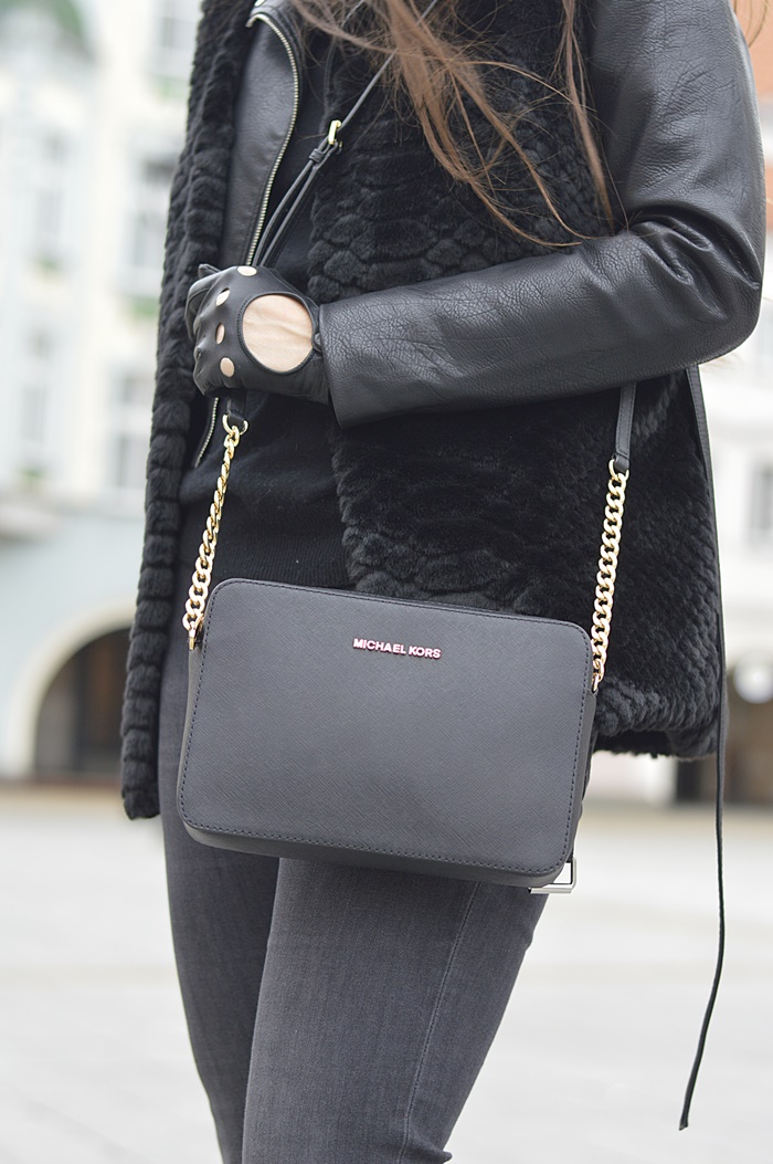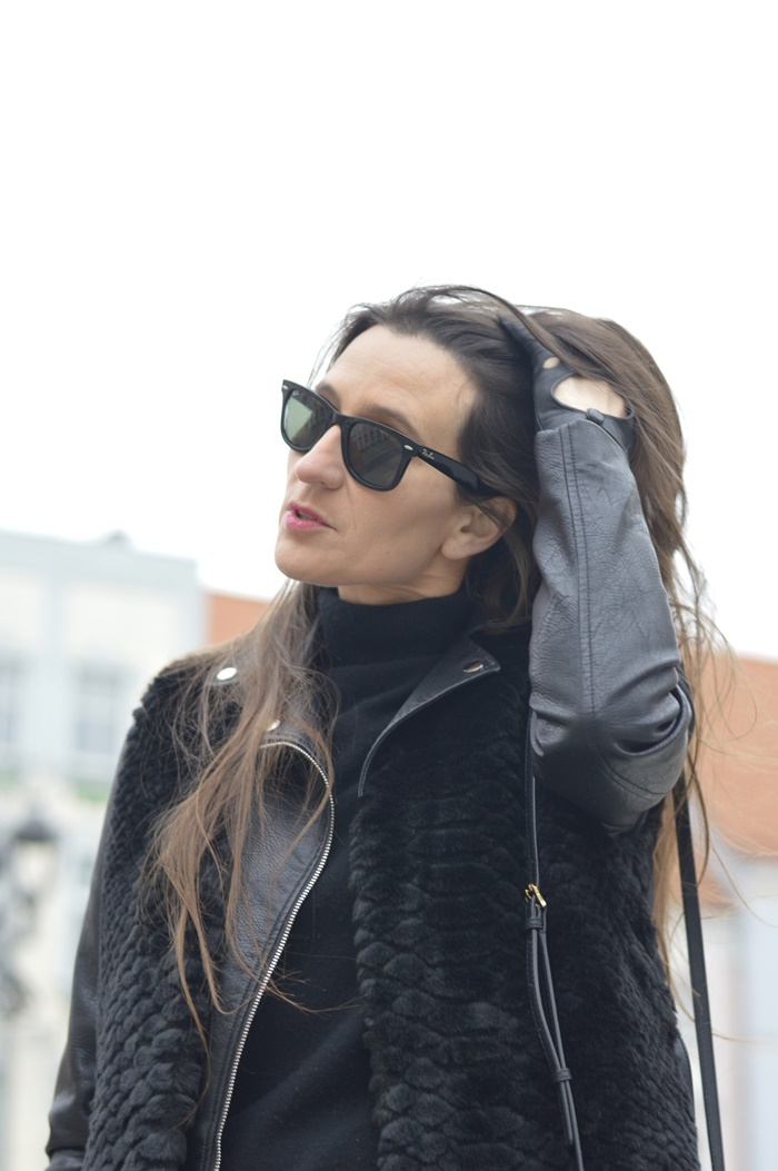 Drugą składową dzisiejszego zestawu są warstwy, które od lat mnie nie zawodzą. Tym razem w ciężkich klimatach, ukierunkowanych na rocka: t-shirt, na nim kaszmirowy golf, syntetyczna ramoneska, i futrzana kamizelka. Do tego botki z masywnym obcasem - bo stabilność i przyziemność to podstawa. Pogoda o tej porze roku zmienna jest i kapryśna: z domu wychodzę zimą, za kilka godzin za oknem jest wiosna, a w pomieszczeniach ludzie preferują jakieś tropikalne klimaty. Przez cały dzień ściągam i narzucam kolejne warstwy. No i jak tu żyć? Taki klimat. Ciężki no ;).