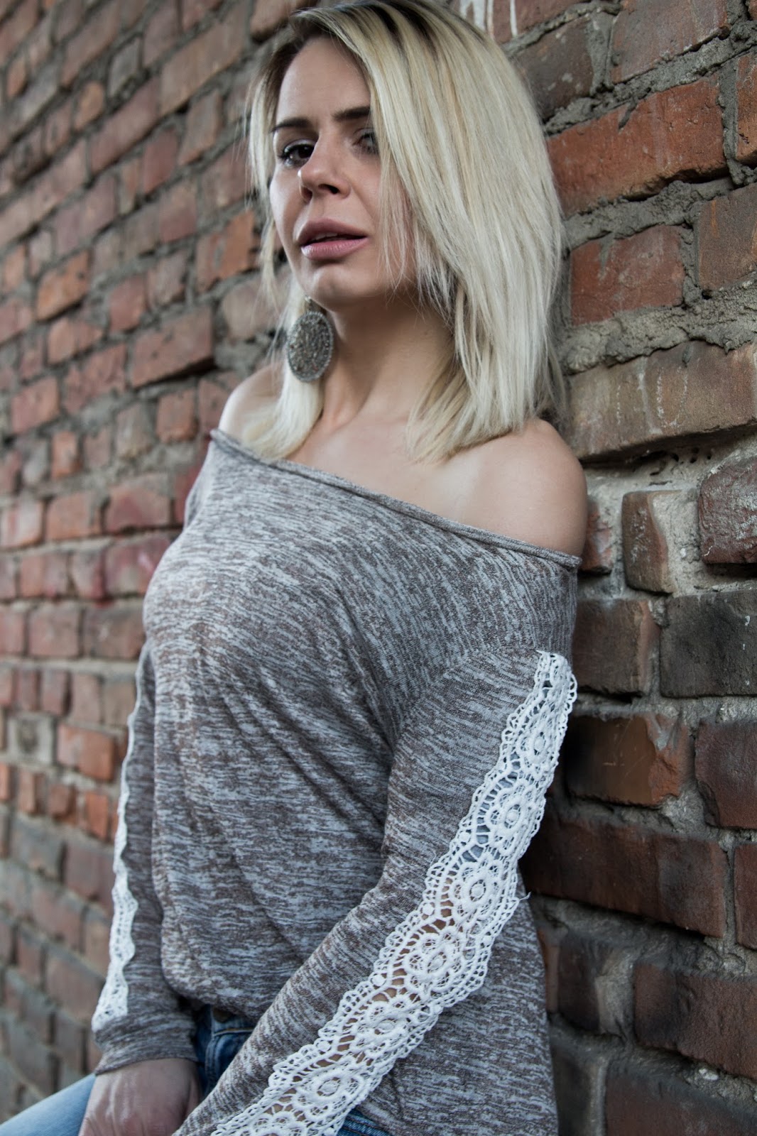Dzianinowa bluzka z koronkową aplikacją na rękawach.