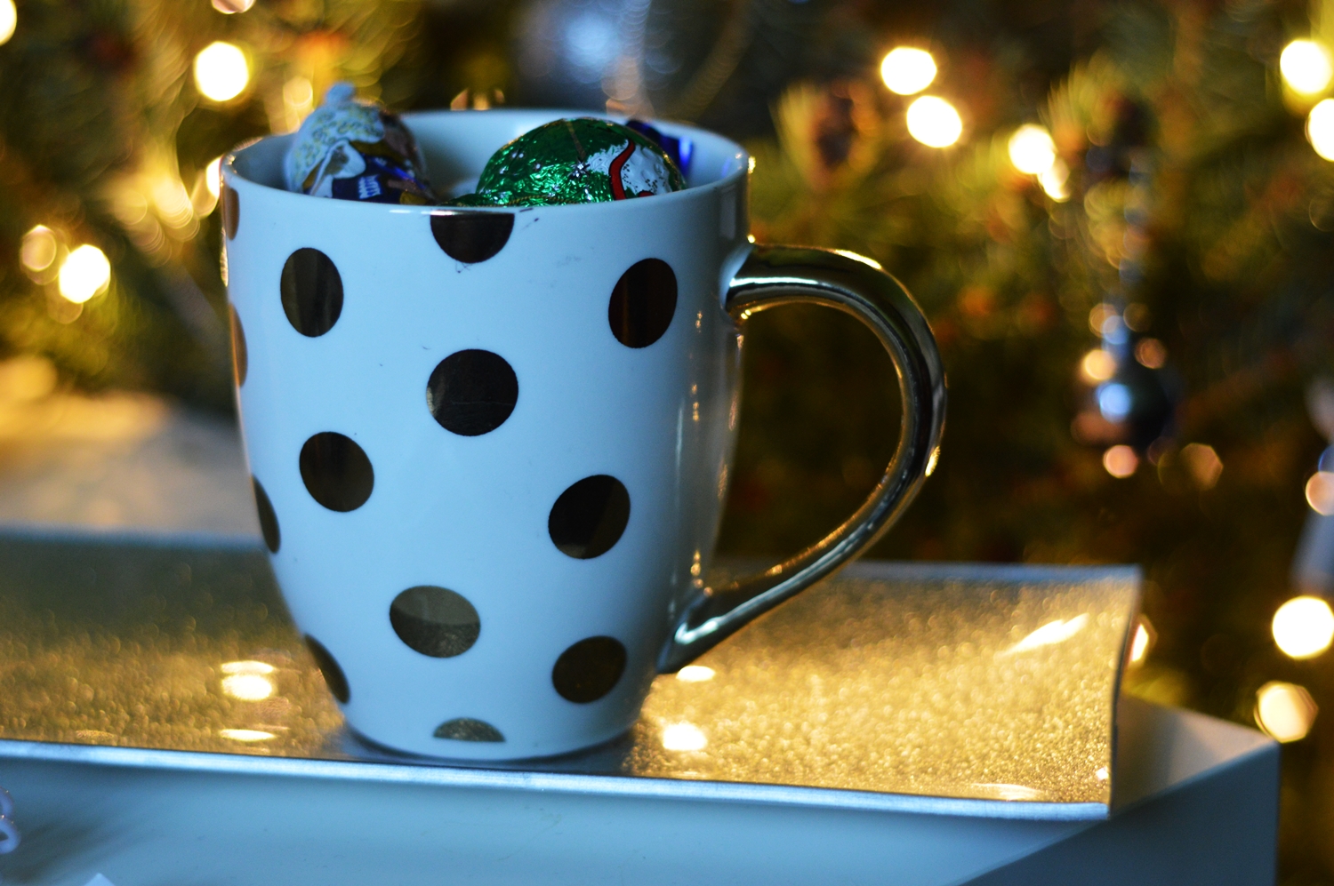 Przed wyjazdem do domu na święta zrobiłyśmy sobie w trójkę losowanie i każda z Nas miała zrobić wylosowanej osobie drobny prezent. Ja otrzymałam mój wymarzony kubek z złote grochy i słodkości w środku ♥