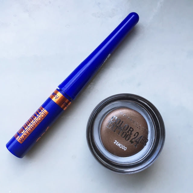 Kolejny świetny eyeliner. Tym razem w pędzelku. Główna funkcja wodoodporność - dzięki niej długo trzyma się na oku. Działa. Drugi produkt to cień w kremie marki Maybelline. Jeden z moich ulubionych kolorów cieni jakie posiadam. Świetna pigmentacja, kolor, trwałość i sposób nakładania. Moja top5.