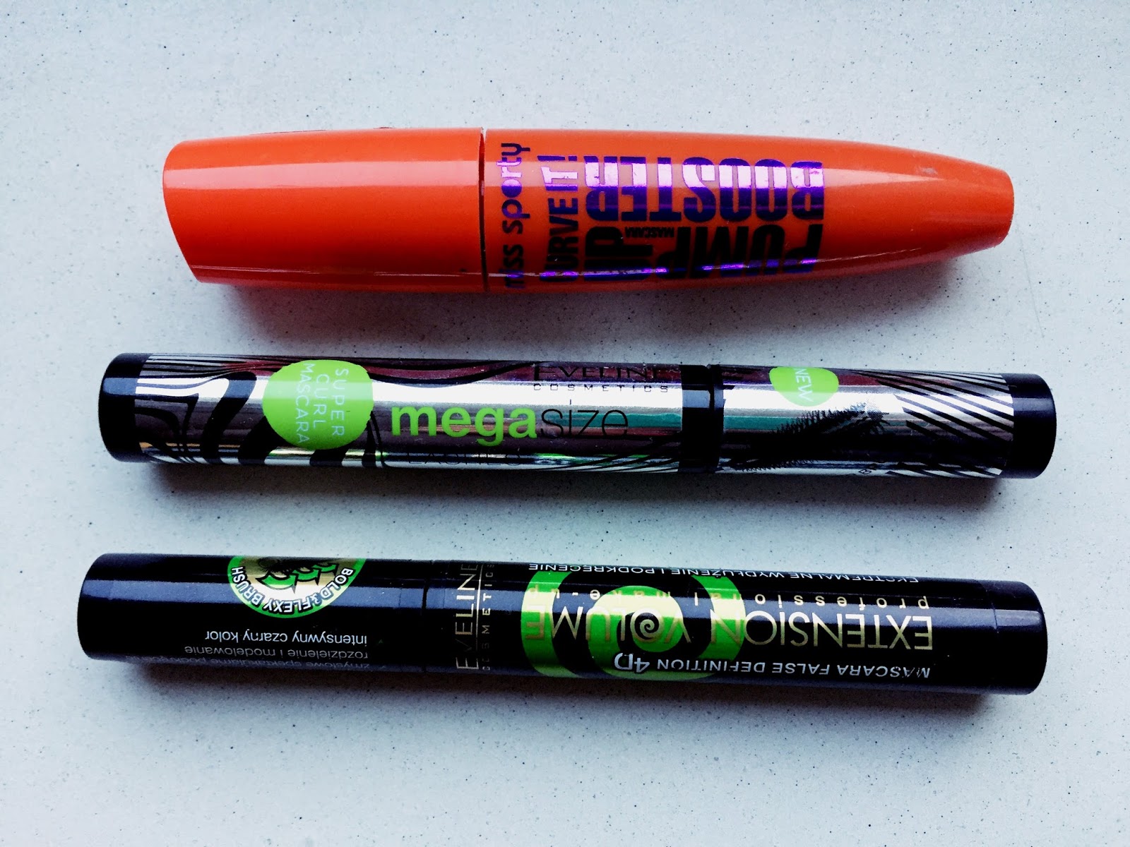Od góry patrząc mamy świetnie podrubiający tusz z Miss Sporty. Używam go już trochę i nigdy mnie nie zawiódł. Drugi dostałam nie dawno, jednak efekty widziałam już po pierwszym użyciu. Znakomicie wydłuża i potrafi wytrwać cały dzień nie zmywając się z rzęs. Trzeci także wydłużający i jednak do niego najczęściej używałam jeszcze jednego tuszu z Maybelline ( który również bardzo polecam) - niestety ostatnio mi się skończył i nie mam jak Wam pokazać.