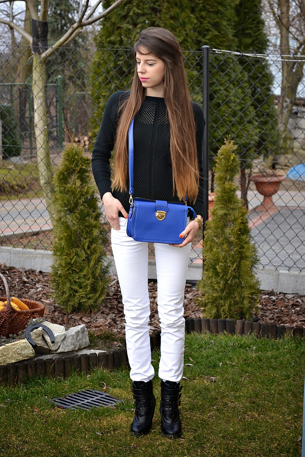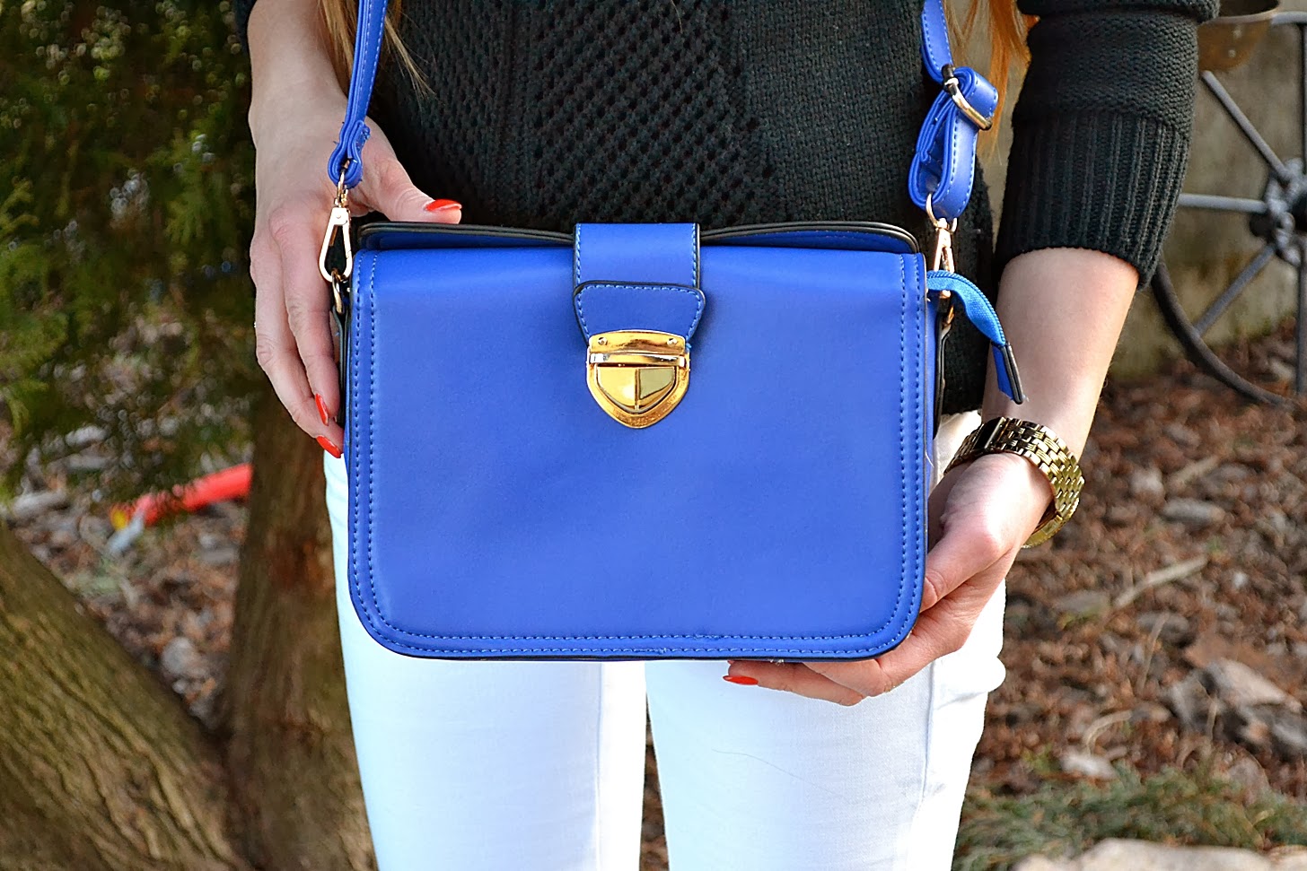 Torebka w kolorze kobaltowym idealnie ożywia całość.