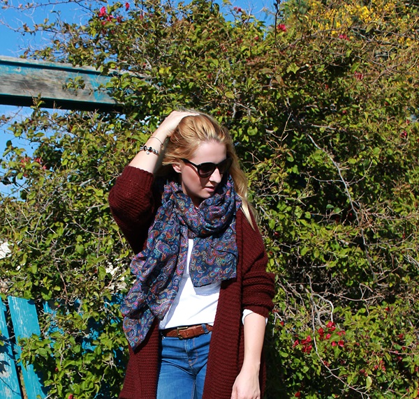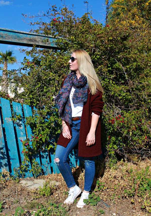 Ponieważ pogoda na Cyprze jest nieprzewidywalna, poranki są jeszcze zimne i przewiewne, oversizowe swetry są dla mnie w zasadzie idealnym modnym dodatkiem. Ten trend można komfortowo wystylizować na wiele sposobów. Tym razem zdecydowałam się połaczyć długi kardigan w burgundowym kolorze z poszarpanymi dżinsami i wygodnymi butami.