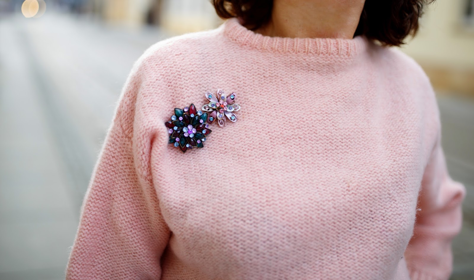 Na górę założyłam prosty, przykrótki sweter w pastelowym różu, ozdobiony broszkami, które również można przypiąć do płaszcza. Lubię takie niekonwencjonalne rozwiązania :) Całość dość prosta ale pełna koloru!