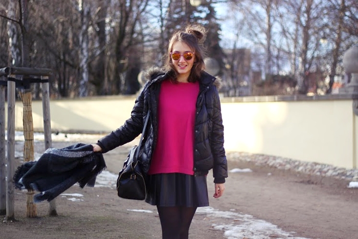 Biała góra i czarny skórzany dół, to dość banalne połączenie. Charakteru nadaje, odstawiany na bok kobalt i swetrzycho, które nieustannie skupia uwagę ;)