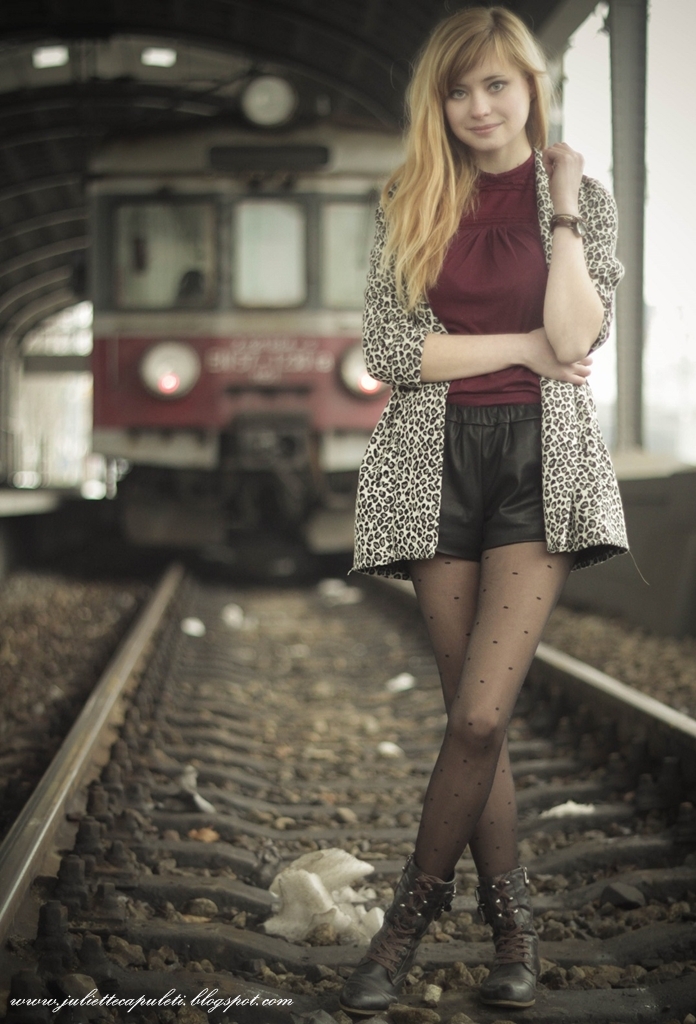 Przejrzałam swoje poprzednie posty, od jakiegoś czasu za bardzo elegancko jest na moim blogu. Uwielbiam łączyć elegancję z kobiecymi stylizacjami, słodkimi dodatkami i delikatnym makijażem. Dzisiaj dla kontrastu przygotowałam coś nowoczesnego - czarne skórzane spodenki, oficerki, burgundowa bluzka i męski blazer. Długo nie mogłam przekonać się do skórzanych ubrań, w szczególności leginsów. Ale w końcu uległam, czarne szorty zupełnie kontrastują z moją natura, jednka w połączeniu z rajstopami w kropki tworzą lekko dziewczęcy akcent.