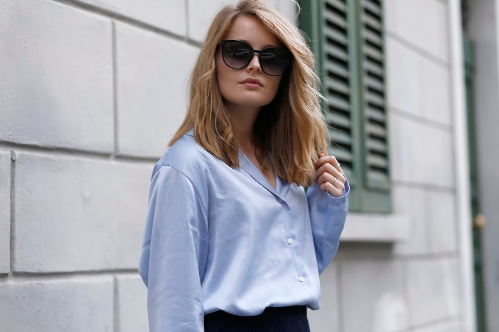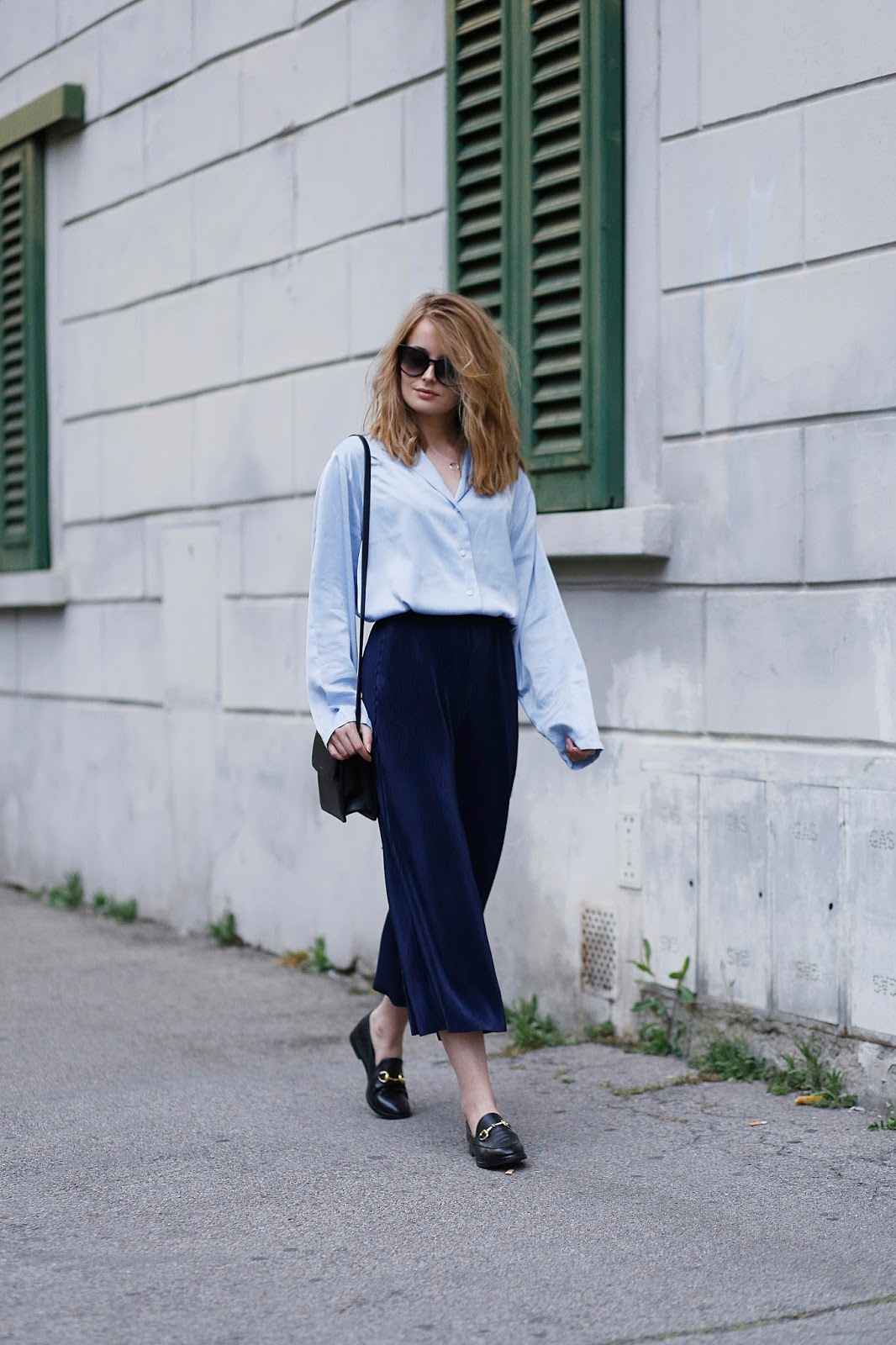 Jeśli chodzi o mój zestaw - jak zwykle postawiłam na proste formy, tym razem jednak w nieco bardziej oversizeowym wydaniu. Granatowe, plisowane culotty połączyłam z luźną, jedwabną, piżamową koszulą. Całość, standardowo uzupełniłam czarnymi, klasycznymi dodatkami :)