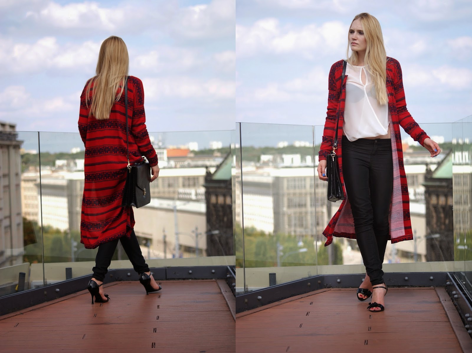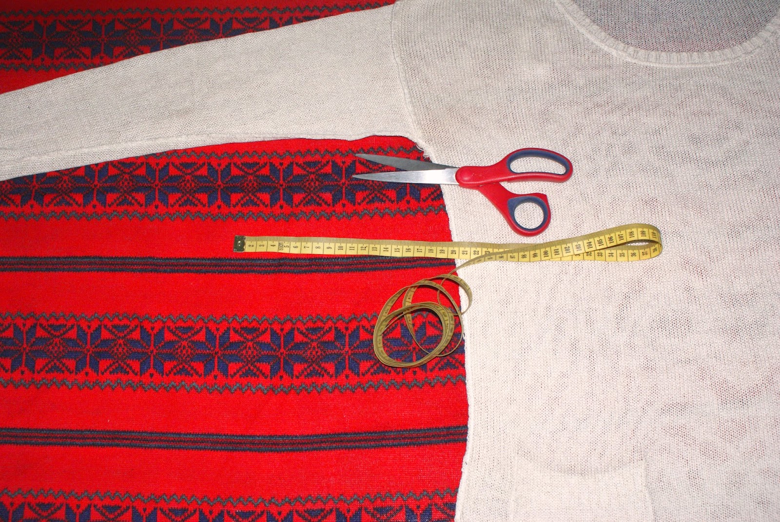Projektanci w tym sezonie proponują różne nietypowe formy swetrów. Od obszernych golfów, poprzez swetry z długimi i szerokimi rękawami, po długie dzianinowe sukienki, a nawet palta. Mi w głowie zaświtał pomysł, żeby uszyć prosty rozpinany sweter, którego charakterystyczną cechą miała być długość. Materiału nie musiałam szukać, ponieważ w wakacje okazyjnie udało się dostać czerwoną dzianinę, która cierpliwie czekała, aż zrobi się troszkę chłodniej i uszyję z niej coś ciekawego. Skorzystałam z formy swojego swetra i zrobiłam kilka modyfikacji.